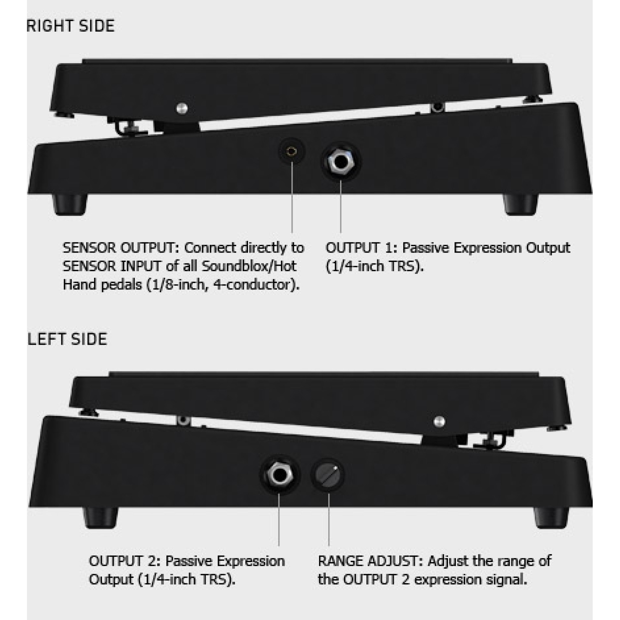 - Сенсорний вихід: 1/8" вихід для підключення до всіх приладів серій Soundblox, Soundblox 2 або Soundblox Pro педалей.