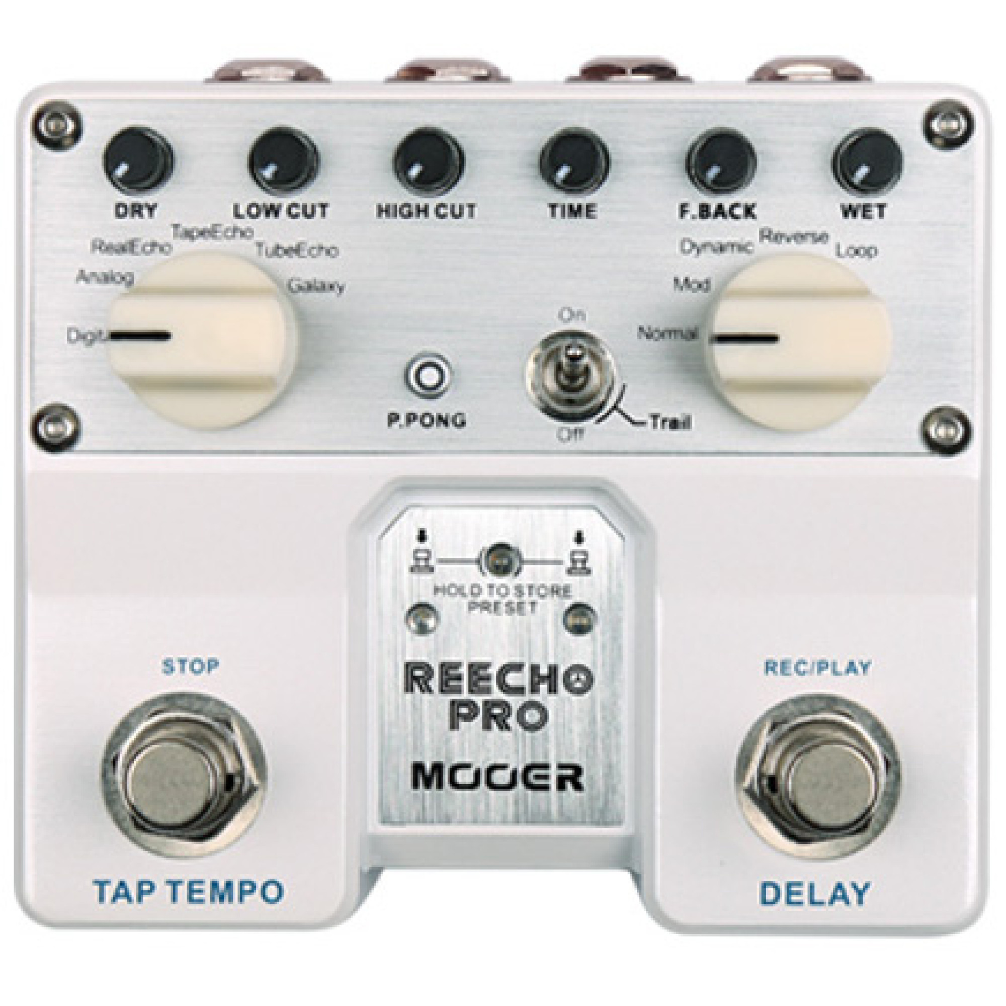 Роки ретельних досліджень і розробок дозволили Mooer створити нову серію педалей - TWIN Series. Reecho Pro відрізняється поліпшеними алгоритмами обробки сигналу і просунутим DSP чіпом, завдяки чому звучання помітно покращилося. Reecho Pro може похвалитися 6 видами ділея і функцією Tap Tempo, що дозволяє швидко і легко регулювати час затримки. Від кришталево чистого Digital Delay і до психоделічного Galaxy Delay - Reecho Pro підійде для будь-якого музичного стилю! Але і це ще не все - Mooer додали три додаткових ефекти, які можуть вживатися разом з дилеєм.