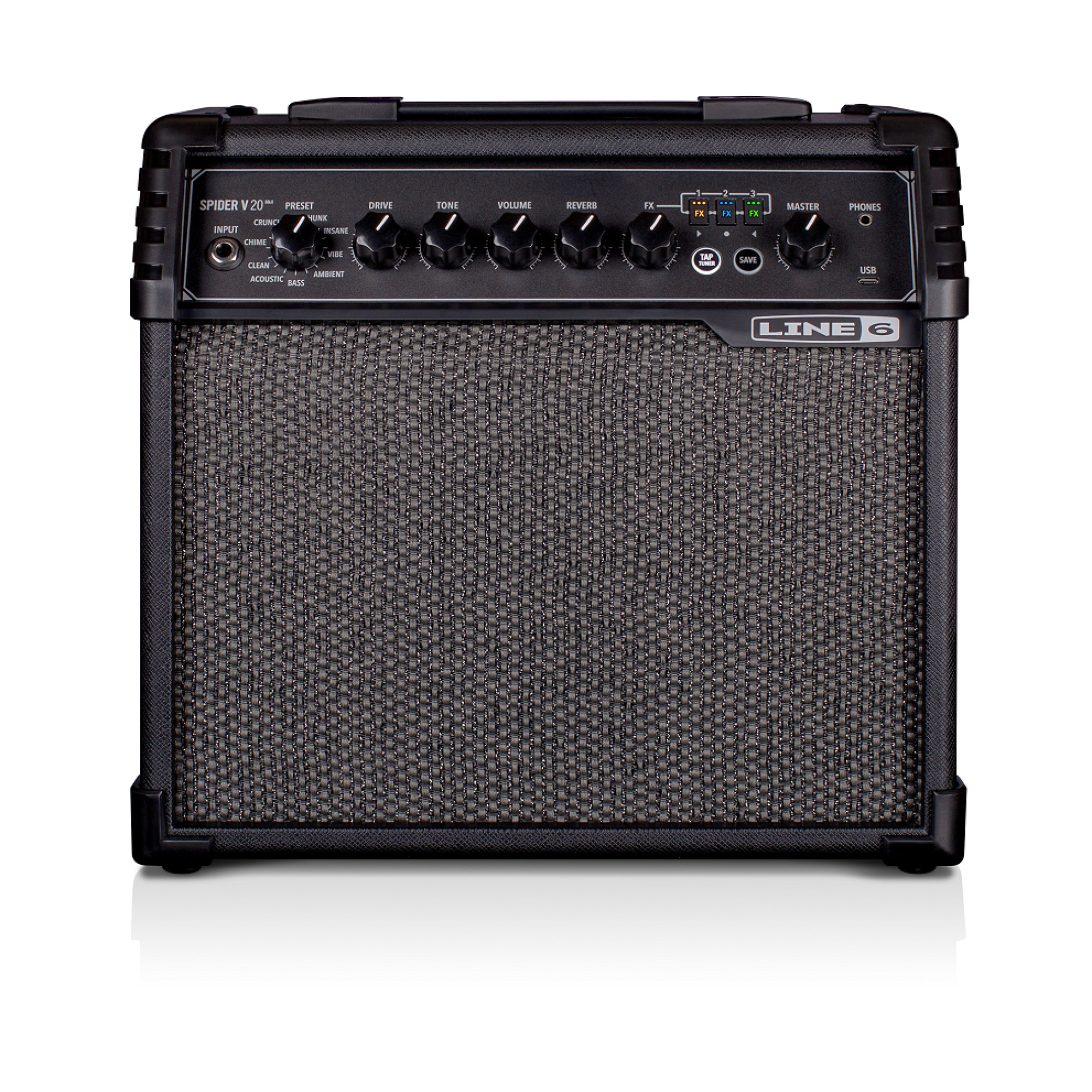 Spider® V 20 відмінно звучить прямо "з коробки". Це ідеальний підсилювач для занять, незалежно від того чи ви граєте через один з 16 різноманітних пресетів, чи налаштовуєте індивідуальні тембри за допомогою простих у використанні елементів управління. Кожен пресет містить три ефекти, які можна вмикати і вимикати в стилі педалей ефектів за допомогою окремих FX перемикачів на передній панелі, а незалежний регулятор ефекту реверберації додасть атмосфери і глибини вашому звуку. Встановлюйте час затримки і ефектів модуляції за допомогою кнопки синхронізації темпу "Tap/Tuner" або натисніть і утримуйте її для доступу до вбудованого тюнера. Порт microUSB дозволяє легко підключити Spider V 20 до PC/Mac або пристрою iOS і Android, де Ви зможете редагувати свої пресети за допомогою безкоштовного додатку Spider V Remote або записувати свою гру в Steinberg Cubase LE (в комплекті).