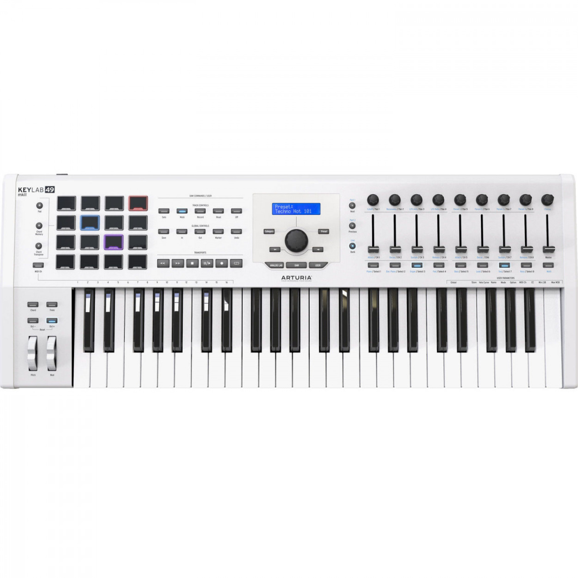 Arturia KeyLab 49 MkII є універсальним MIDI-контролером, який включає в себе 49 чутливих до швидкості клавіш з післядотиком, клікабельний енкодер, 9 додаткових енкодерів, 9 слайдерів, 16 сенсорних і чутливих до тиску педів з RGB підсвічуванням, 6 перемикачів керування, 4 командних перемикачі, колесо модуляції та колесо pitch-bend.