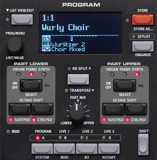 - MIDI Upper Split функція: можливість контролювати весь спектр звуку, призначеного на верхню частину (Part Upper) за допомогою зовнішньої міді-клавіатури, використовуючи при цьому клавіатуру Nord Electro 5 для обраного звуку нижній частині (Part Lower).