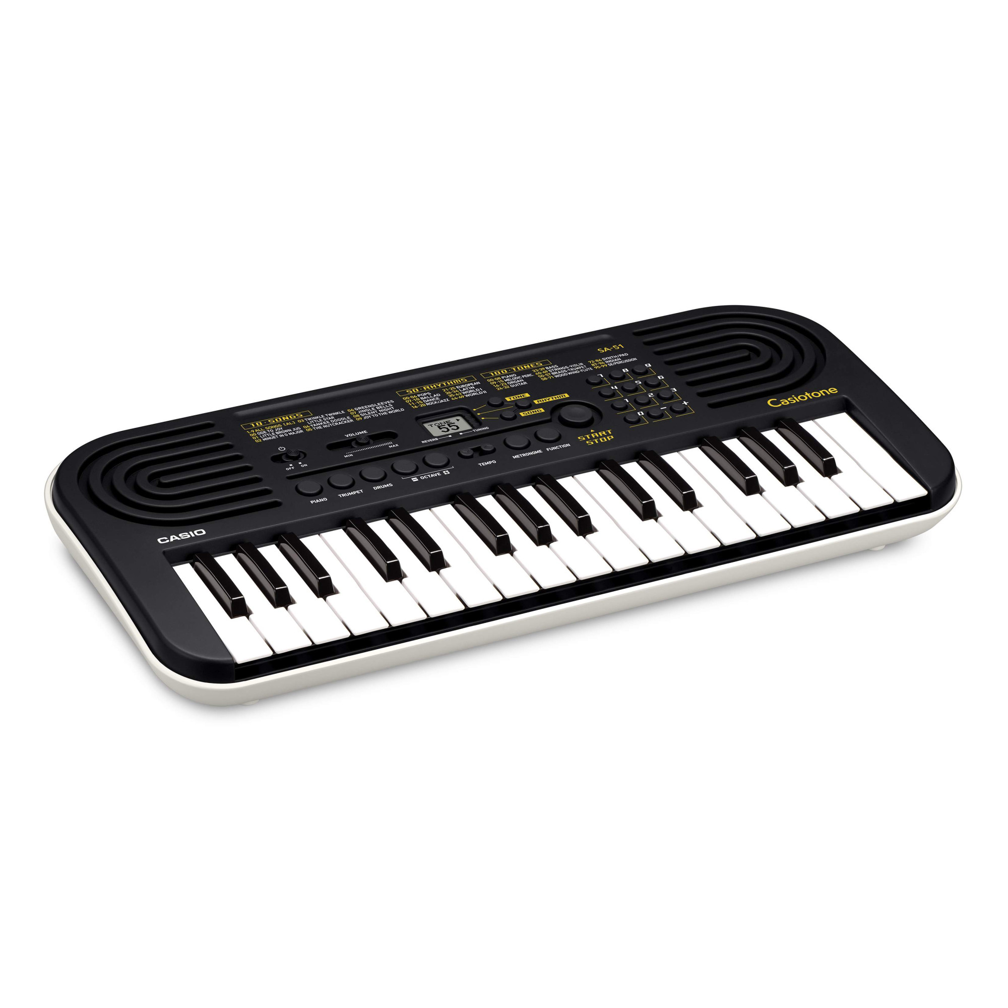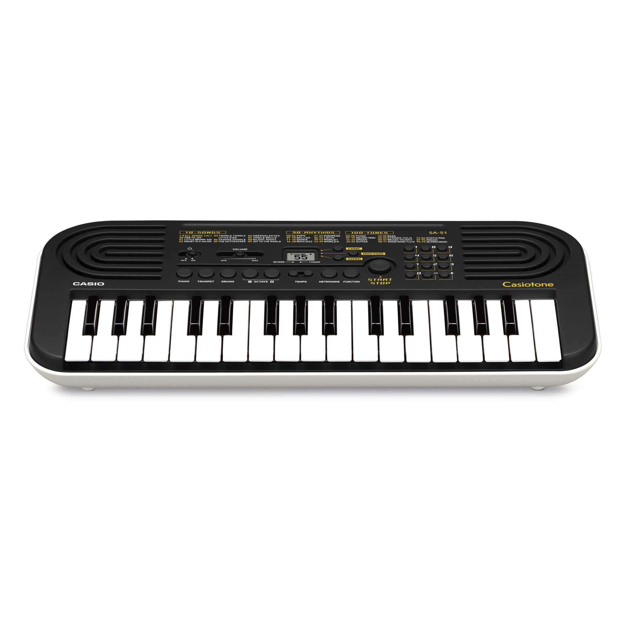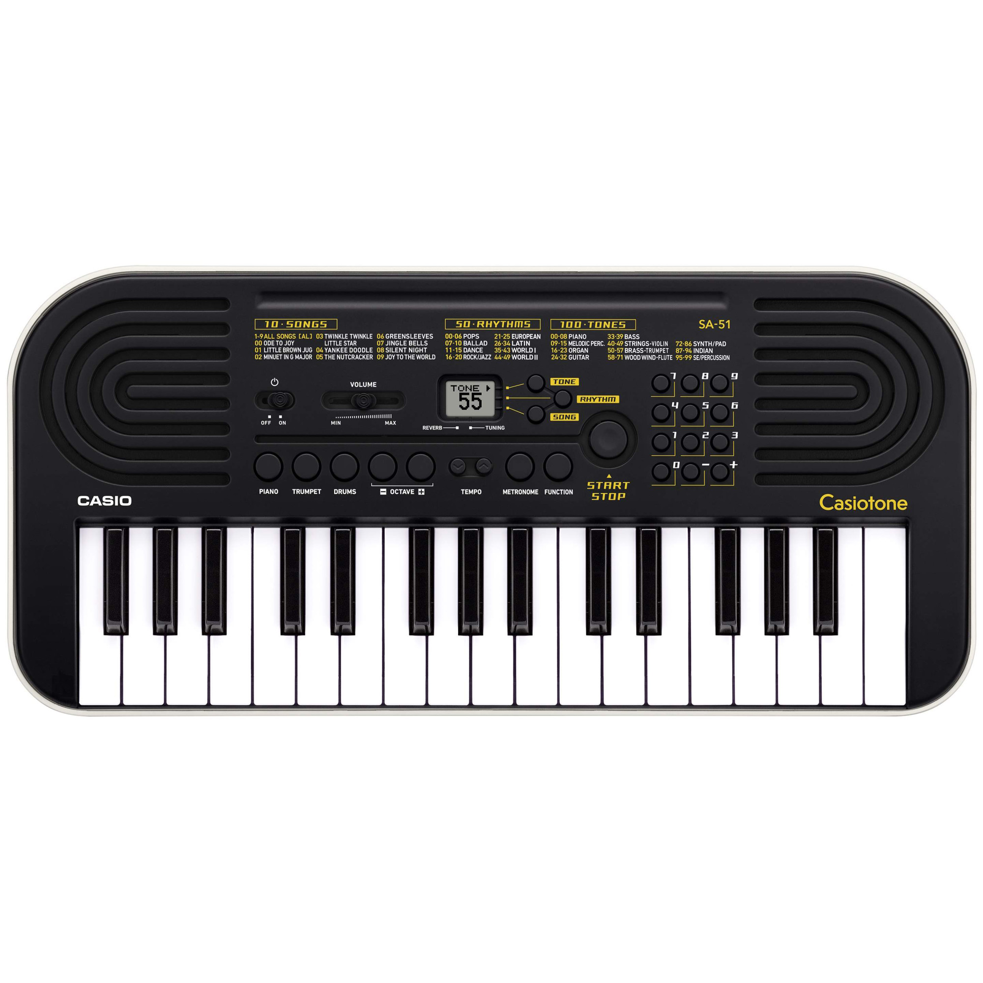 Простий у використанні та веселий у грі, Casio SA-51 – ідеальний вибір для першого клавішного інструменту. 32 міні-клавіші полегшують гру навіть для маленьких рук. 100 високоякісних вбудованих тембрів, що охоплюють широкий спектр інструментів, включаючи фортепіано, духові, ударні та багато інших. Найпопулярніші тембри можна вибирати не лише за допомогою цифрової панелі, але й скориставшись спеціальними кнопками прямого вибору. 50 ритмів у різних жанрах, включаючи поп, балади, танці і т.д. Завдяки функції відключення мелодій можна відключити мелодію у вбудованих композиціях і підігравати самому, а можливість уповільнення мелодії та функція метронома допоможуть довести виконання до досконалості.