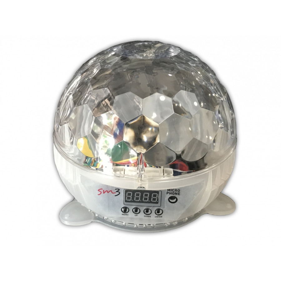 Світлодіодний диско куля STLS SM3 - це прекрасний вибір для будь-якого невеликого кафе, караоке залу або ж домашньої кімнати. Пристрій виконаний повністю з білого і прозорого пластика і поєднує в собі відразу два пристрої, а саме традиційна диско-куля і ефект сонечка, який так само представлений окремо пристроєм STLS VS-43а.