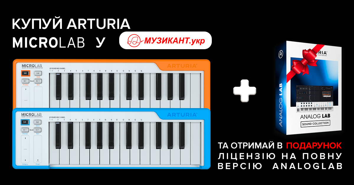 Ми ж в свою чергу вирішили влаштувати безпрецедентну акцію, щоб іще більше посилити і без того вражаючий творчий потенціал MicroLab. Відтепер, купучючи цей пристрій, Ви також отримуєте ліцензію на повну версію потужного і справді надихаючого ПЗ Arturia Analog Lab 4, що надасть Вам доступ до понад 6500 приголомшливих пресетів для більше 30 класичних клавішних інструментів, разом із ідеальною інтеграцією з Microlab.