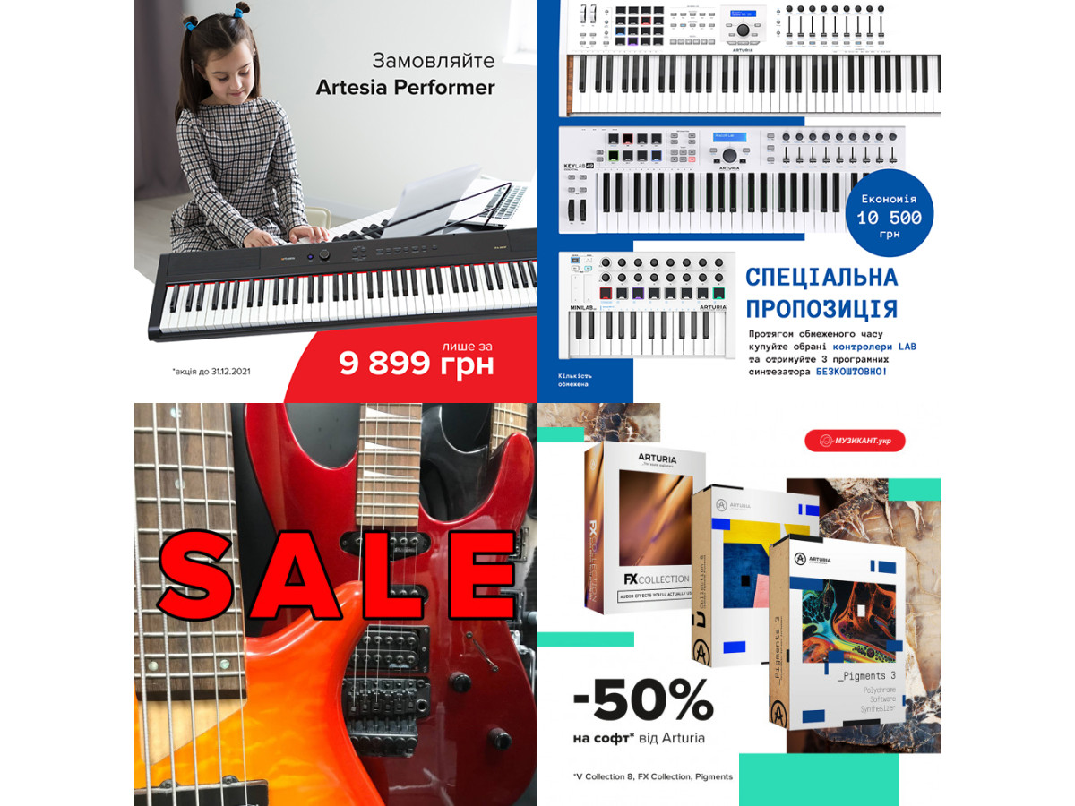 Музикант.укр спільно з Arturia запустили обмежену за часом акцію на окремі контролери серії Lab. Ця ексклюзивна акція означає, що при покупці MiniLab MkII, KeyLab Essential або KeyLab MkII, Ви отримаєте 3 додаткові програмні синтезатори Arturia (вартістю понад 10 500 грн) безкоштовно на додаток до існуючих програмних пакетів. Це чудова можливість для тих, хто хоче придбати новий контролер, щоб оновити свою колекцію для створення музики за допомогою програмних продуктів, що найбільше продаються, без додаткових витрат! Ціни актуальні до 31 грудня, поспішайте!