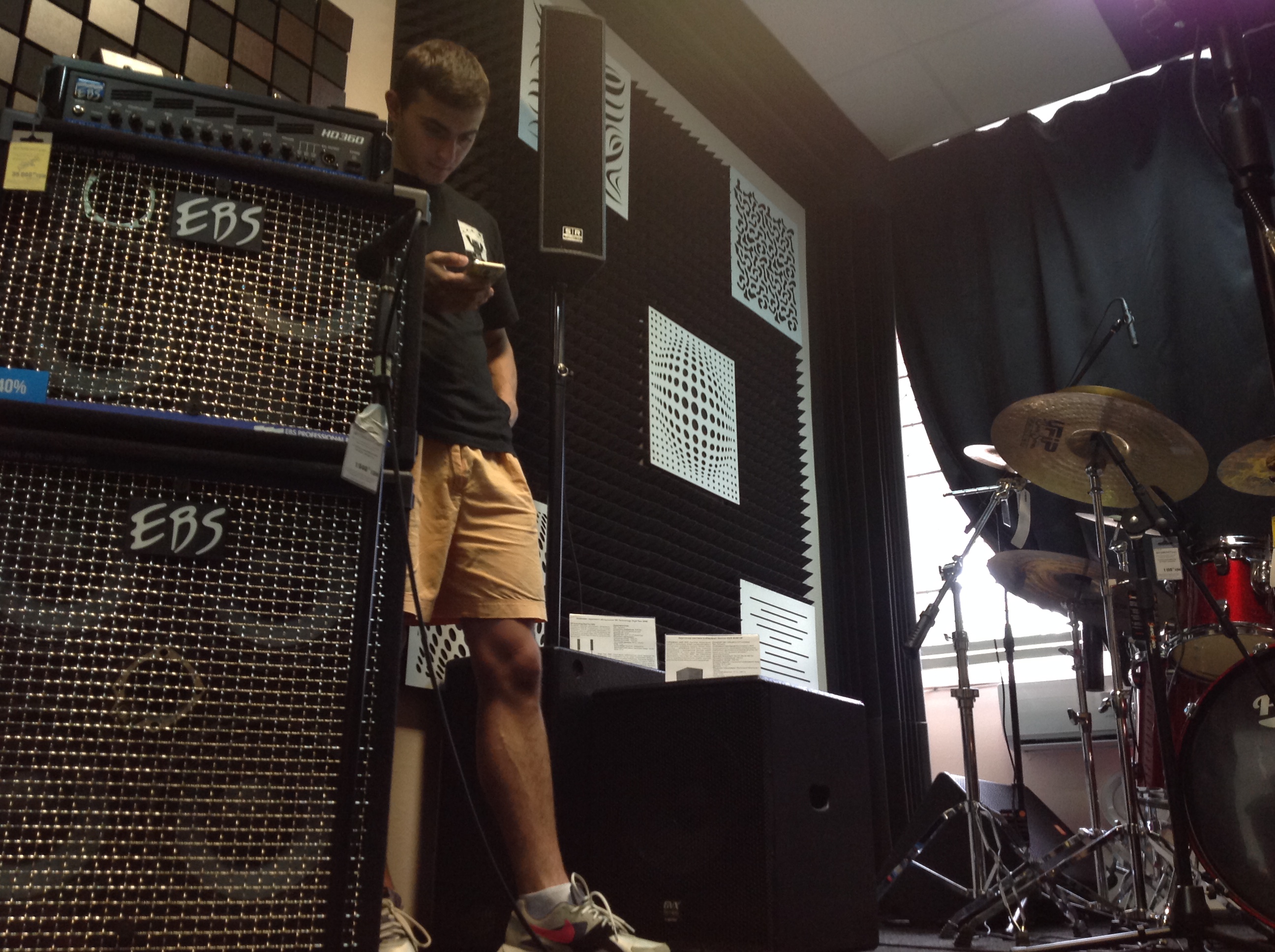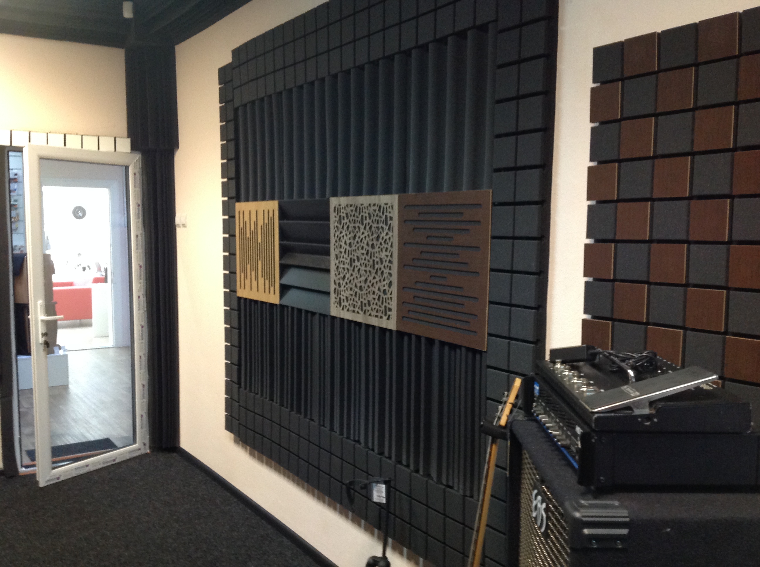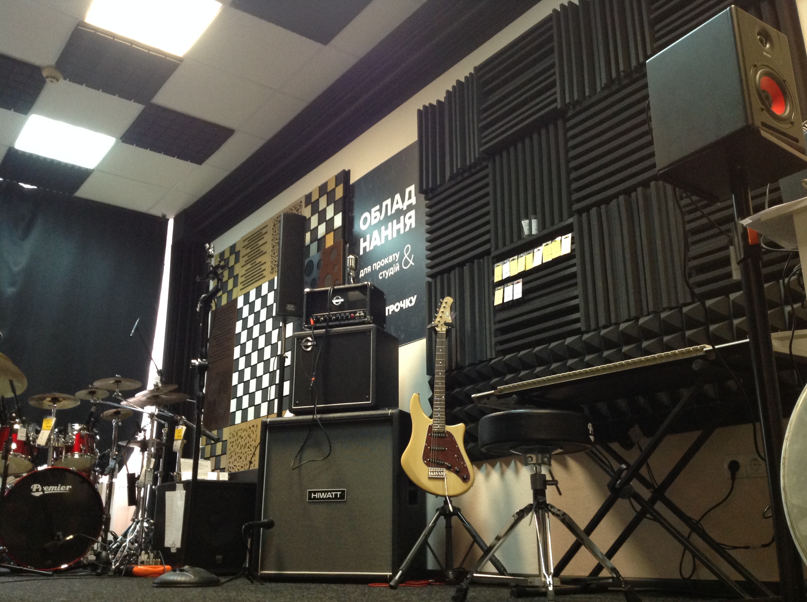 Компанія Ecosound із захопленням прийняла нашу пропозицію про співпрацю і забезпечила магазин усім необхідним, аби зробити зі звичайнісіньких чотирьох стін справжню Кімнату звуку, де ніякий сторонній шум не зможе стати на заваді Вашому єднанню з творчістю. Ковролін висотою 5 мм на гумовій основі сприяє додатковій звукоізоляції, а рекуператор тепла дозволяє автоматично провітрювати приміщення при зачинених вікнах. Тут є все, — акустичні панелі, дифузори, екрани — що нарешті дозволить Вам сприймати слова Земфіри «Хочешь, я убью соседей, что мешают спать» (у нашому випадку «грати») просто як рядки з відомої пісні, а не як сумну правду життя.