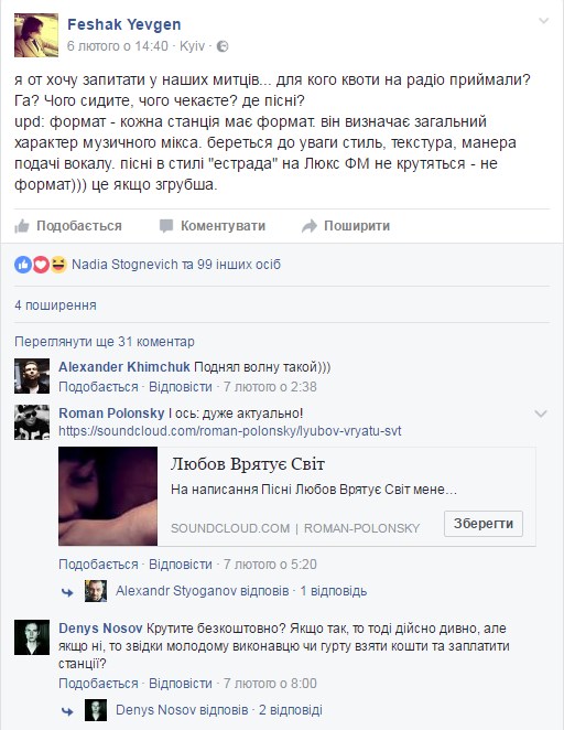 Також 6 лютого на своїй сторінці у Facebook відомий шоумен, продюсер та радіоведучий «Люкс FM» Євген Фещак написав: