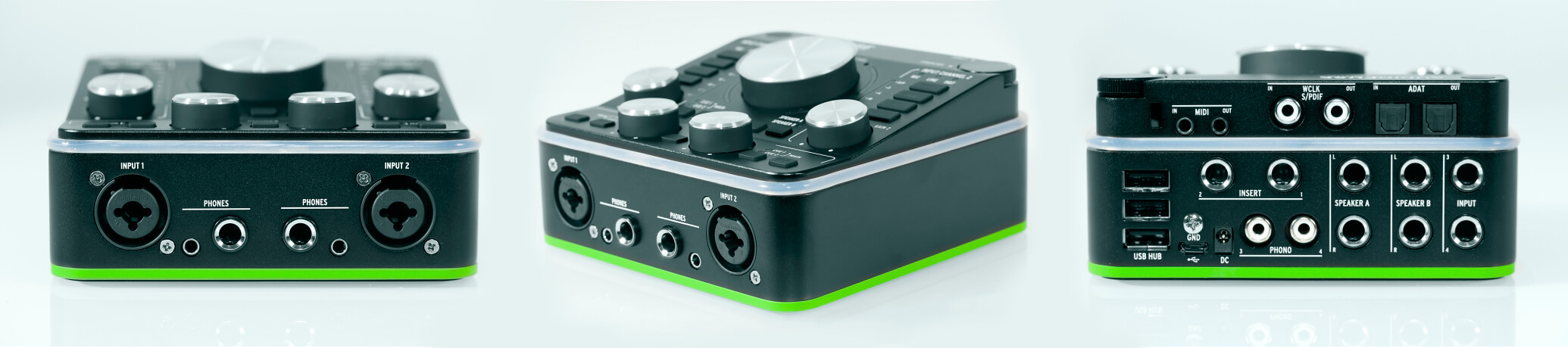 MIDI-роз’єми зроблені на перехідниках, які наявні в комплекті. Те, що інтерфейс підтримує WordClock і ADAT, робить його придатним для роботи в повноцінній професійній студії. Є вхід PHONO 3/4 для крутилок, з RIAA-коректором. Є навіть інсерти INSERT 1/2 для підключення зовнішнього ефект-процесора, який буде включений в розрив до оцифровки. (Інсерти також будуть корисні, якщо заманеться спробувати використати інтерфейс як суто передпідсилювач.) Є окрема кнопка REAMPING і GROUND LIFT. Вхід 3 можна, до того ж, перемкнути в гітарний. Це, загалом, зроблено для реампінга.