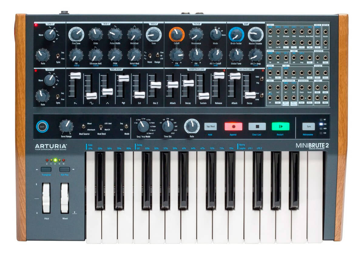 - Однією з найважливіших характеристик будь-якого синтезатора є тип його VCO: це та частина, яка відповідає за генерацію звукового електронного сигналу певної форми хвилі та висоти тону, і за своєю суттю є осцилятором. Різні типи цього осцилятора впливають і на характер генерованого сигналу, отже, і на його якість. Синтезатор Arturia MiniBrute 2, що має два змінні генератори звука, дозволяє отримувати значно ширший спектр гармонік (відповідно, більш насичене і розмаїте звучання), на відміну від своїх конкурентів.