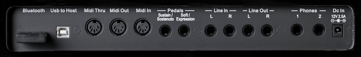 Підключення: Bluetooth connector, L/R Outputs, L/R Inputs, USB to Host, Midi In/Out/Thru, Pedal 1 & 2 connectors, DC12V Power