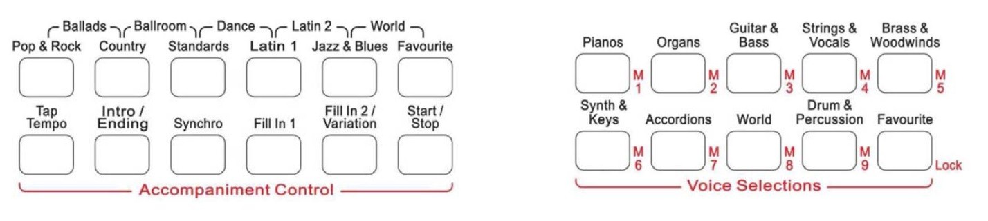 | Ритми | 350 стилів – 2 варіації, Вкл/Викл автоакомпанімента, автоматичний режим, синхронізація, метроном, гучність ударних, гучність |