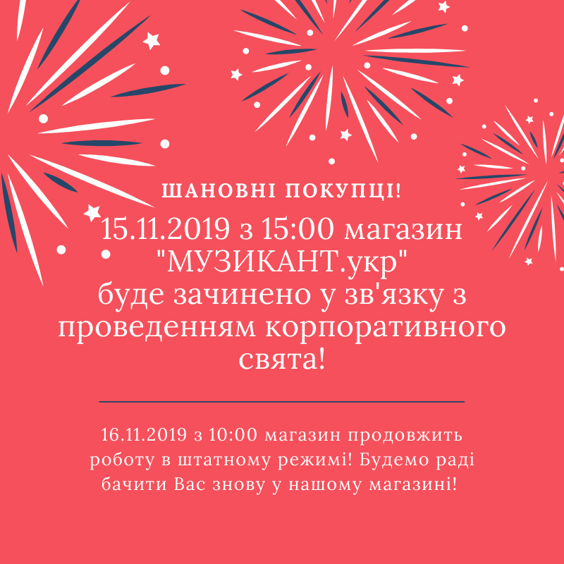15.11.2019 з 15:00 магазин "МУЗИКАНТ.укр", розташований за адресою: м. Київ, вул. Солом'янська 5, буде зачинений у зв'язку з проведенням корпоративного свята!