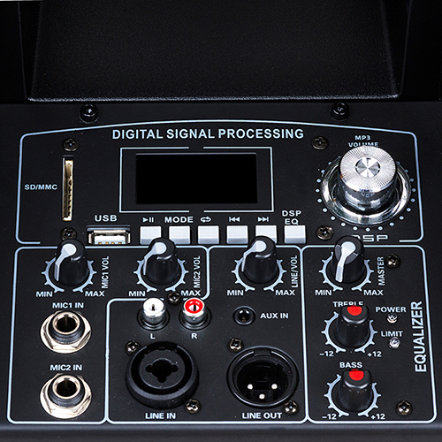 Секція мікшера має 2-смуговий еквалайзер з регулятором загальної гучності та окремі регулятори гучності для обох мікрофонів і лінійного входу. Регулятор гучності MP3-плеєратакож виконує функцію контролю DSP.
