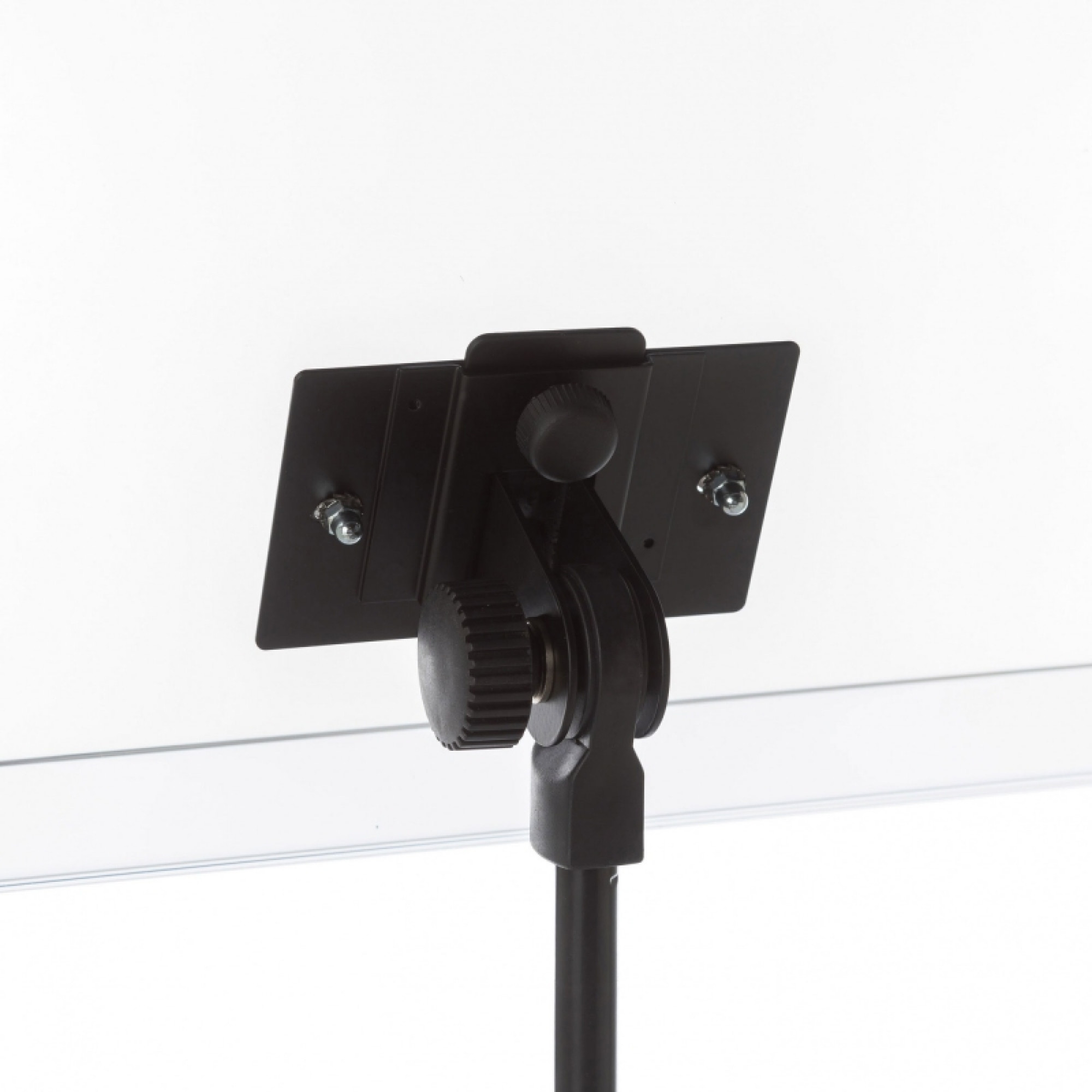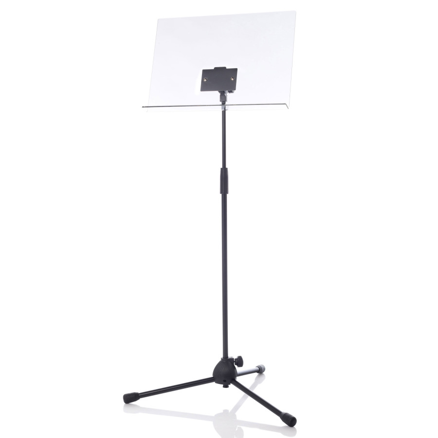Профессиональный пюпитр со съемной подставкой для нот из прозрачного оргстекла. Стойка изготовлена из стали. Высота регулируется в пределах 83-142 см.
