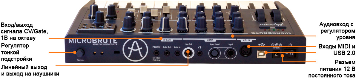 MicroBrute поддерживает стандартный формат этого управляющего интерфейса в 1В/октаву, используемый в большинстве современных модульных синтезаторов, а также в MinіBrute. Это делает MicroBrute отличным дополнительным приобретением как для тех, кто использует модульные синтезаторы, так и для владельцев MiniBrute.