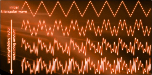 Режим Metalizer задействует исходную треугольную форму волны и ‘’деформирует/сгибает’’ ее, создавая более сложную зубчатую форму, насыщенную верхними гармониками. Результатом является характерное звучание типа hard sync sweep, хорошо подходящее для хардкорного баса или ‘’злых‘’ соло-звуков синтезатора. По умолчанию ENVELOPE настроен на этот параметр посредством MOD MATRIX. Просто накрутите регулятор ENVELOPE до какого-нибудь интересного звука, и Вы сразу услышите, что это за эффект.