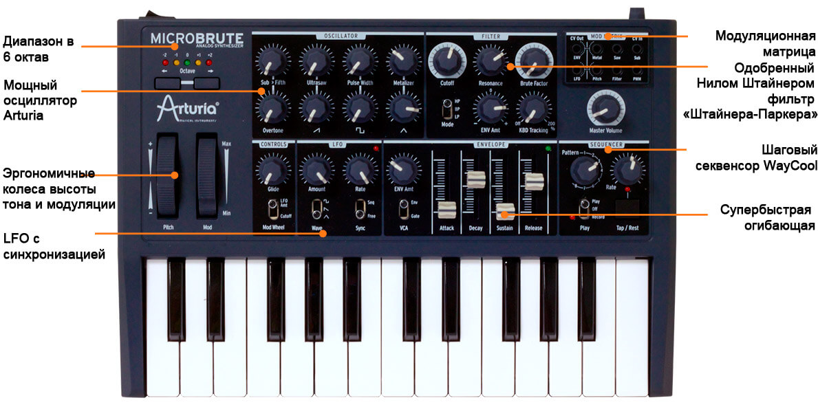 Если Вы новичок в синтезаторах, то обратите внимание – перед Вами один из самых простых в использовании и доступных приборов с уникальным звуком. А если Вы — ветеран синтезаторных битв, то от Вашего внимания не ускользнуло, что MicroBrute – это очень серьезный, оснащенный секвенсором полумодульный ‘’зверь’’. Вам просто осталось услышать, как он звучит.