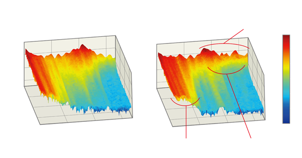 Изображения выше показывают сравнение акустических спектральных характеристик, измеренных в одинаковых условиях для обычной гитары и гитары L серии с применением технологии A.R.E. Обратите внимание на увеличенную интенсивность и сустейн в низкочастотном диапазоне и выравнивание по уровню среднечастотного диапазона, что в итоге выливается в более сбалансированное и ясное звучание баса с использованием A.R.E. Также важно отметить, что высокие частоты имеют меньшее время затухания после атаки, создавая более "острое" звучание.