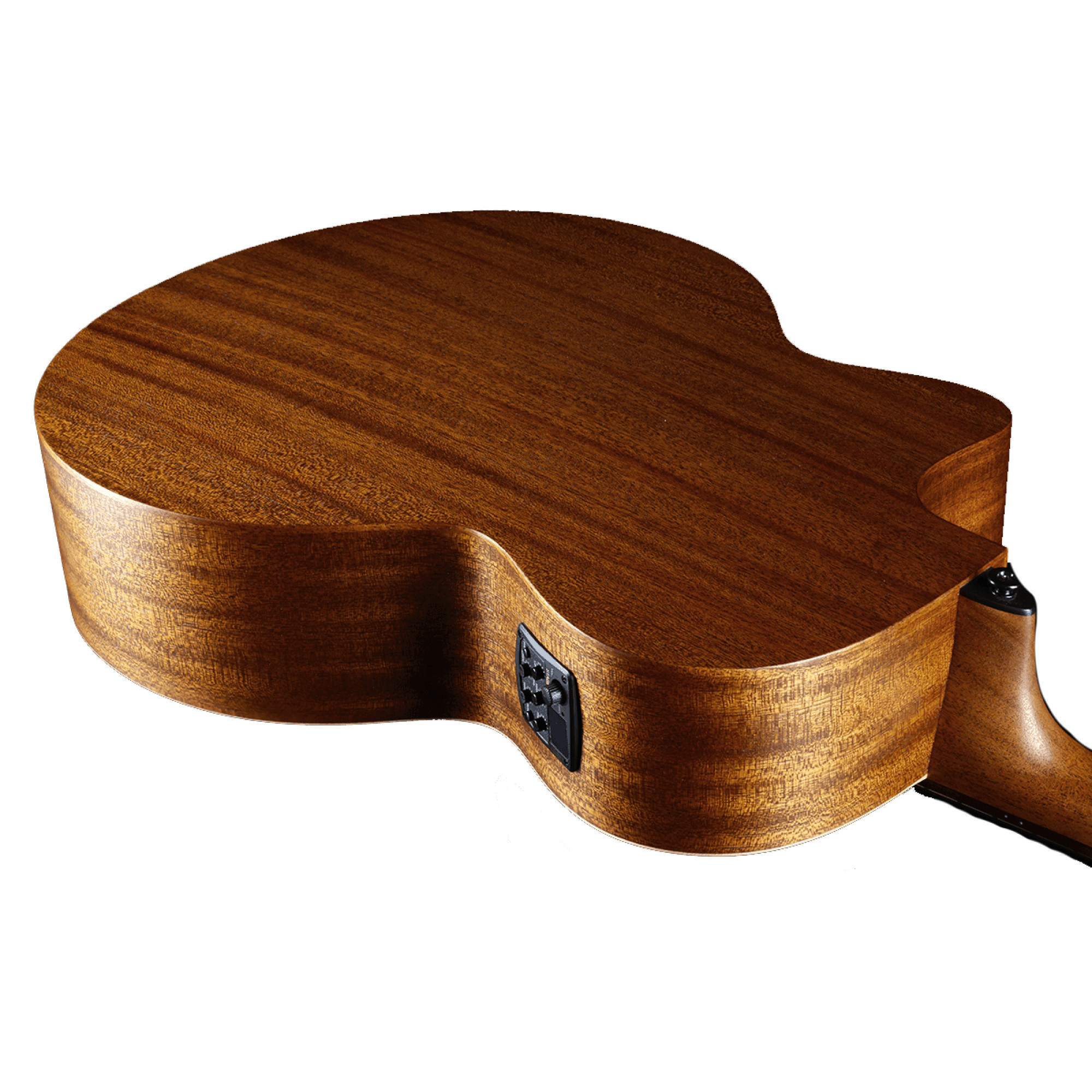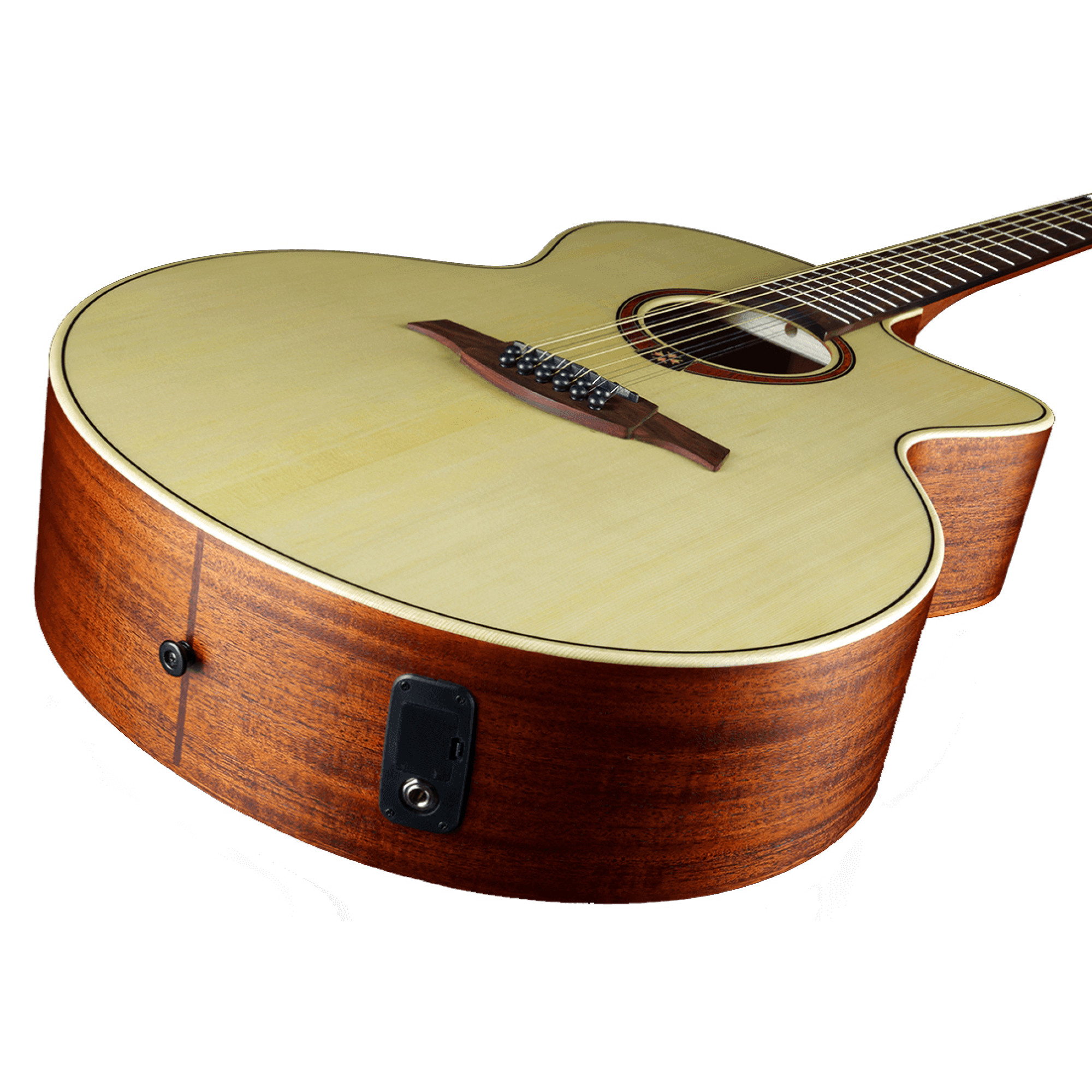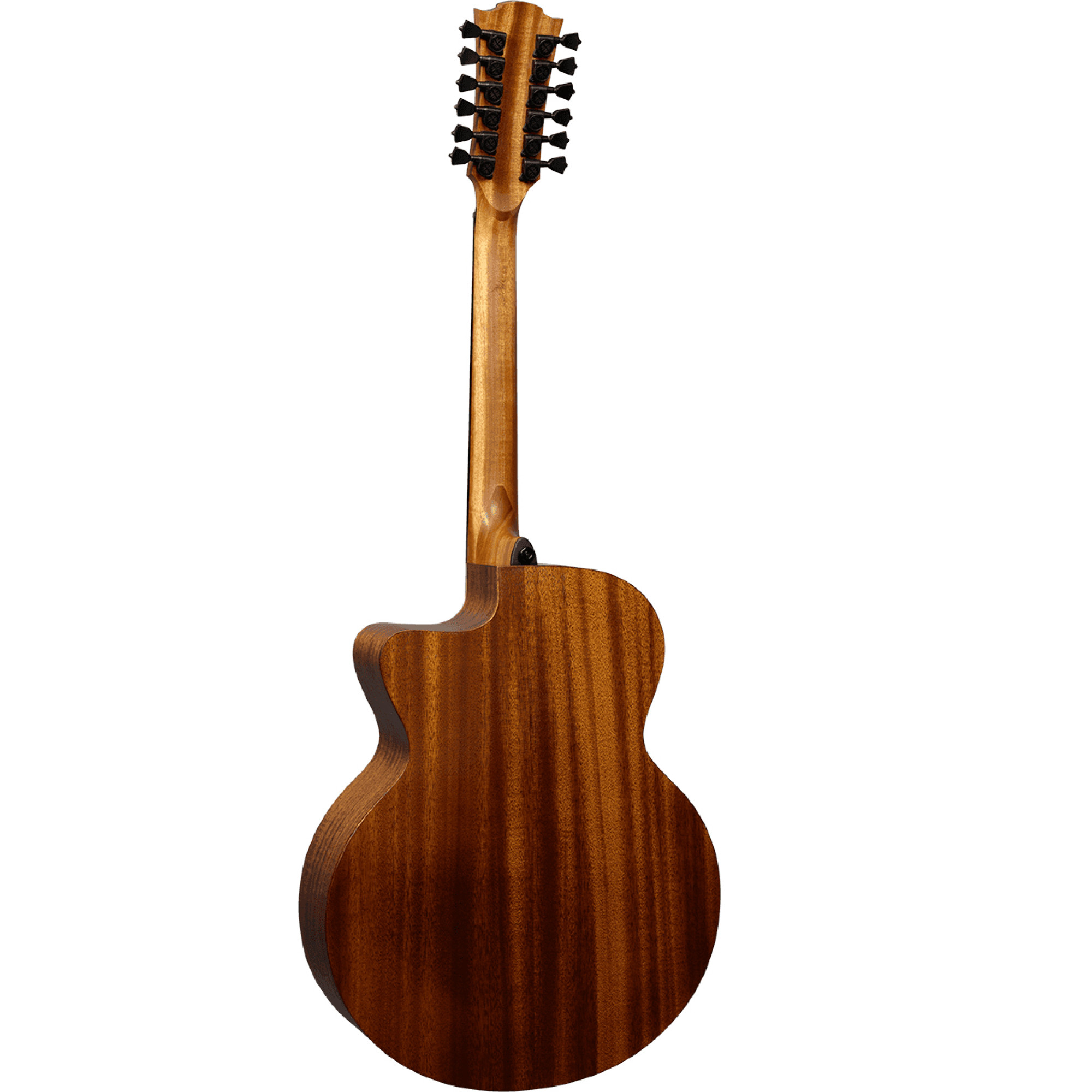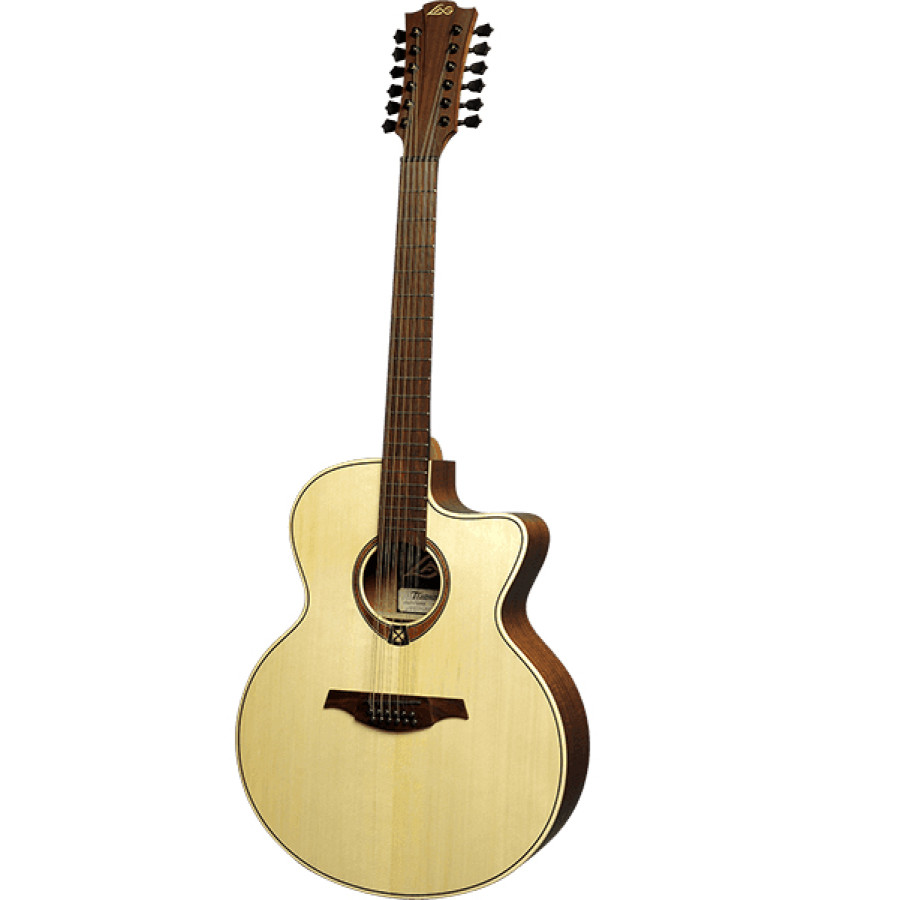 LAG Tramontane T177J12CE – это 12 струнная 25,6-дюймовая гитара Jumbo cutaway с цельным топом из энгельманской ели, ламинированной спинкой / грифом из махагони (тропического дерева, принадлежащего к семейству красного дерева, с текстурой, похожей на гондурасское дерево, приглушенными низкими и высокими частотами) и грифом из коричневого BrankoWood (искусственная форма палисандра). Коричневое дерево – идеальный заменитель палисандра, получаемый из короткоцилиндрической сосны из Новой Зеландии.