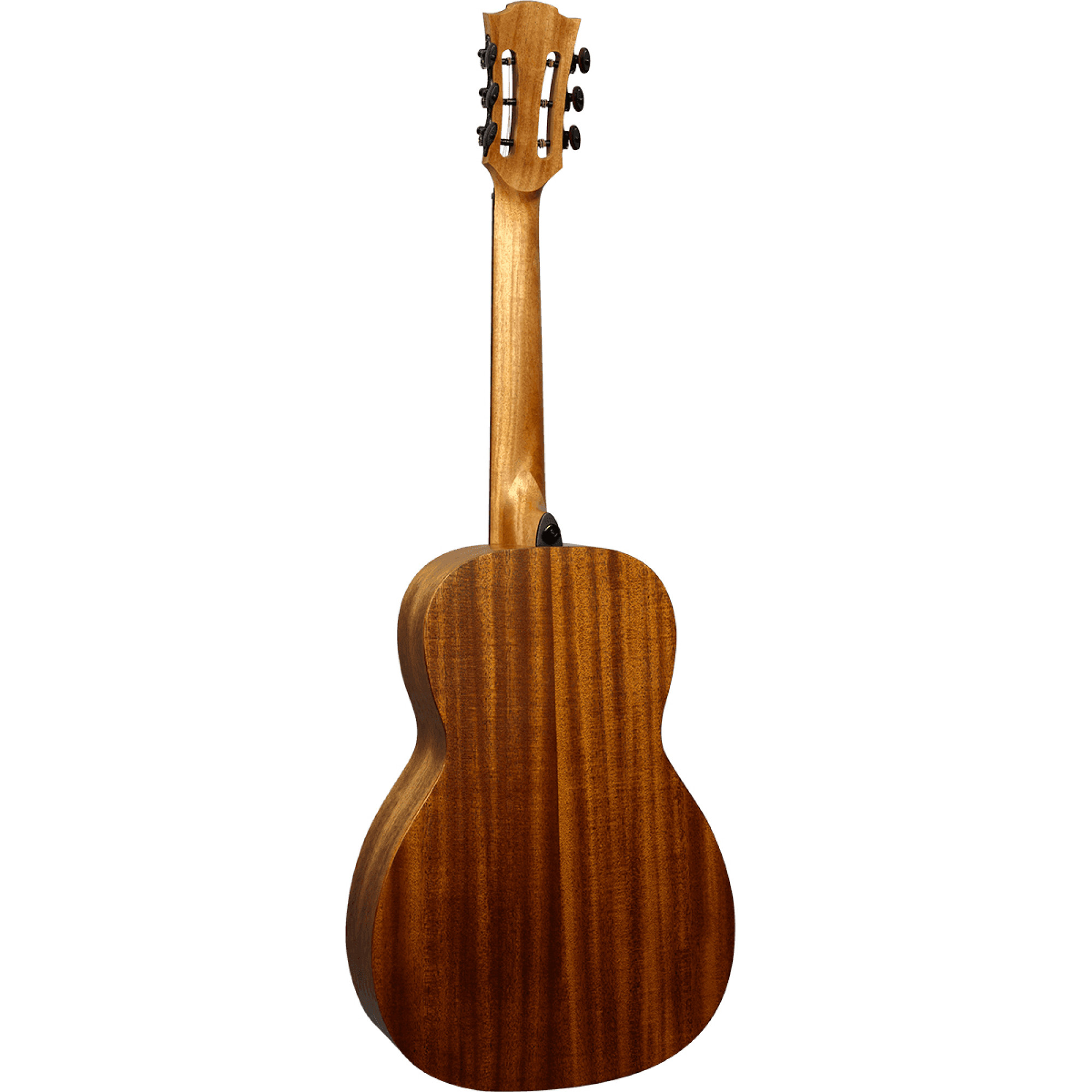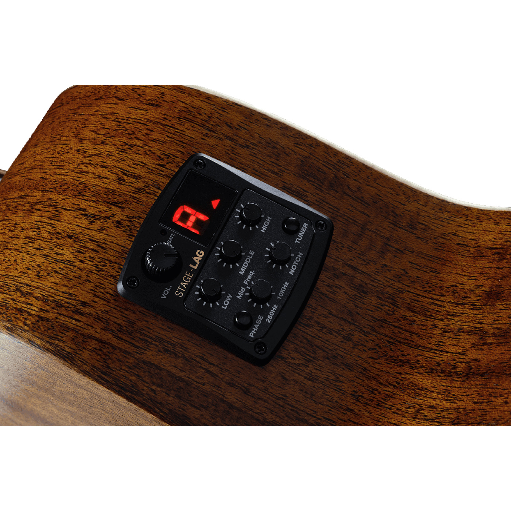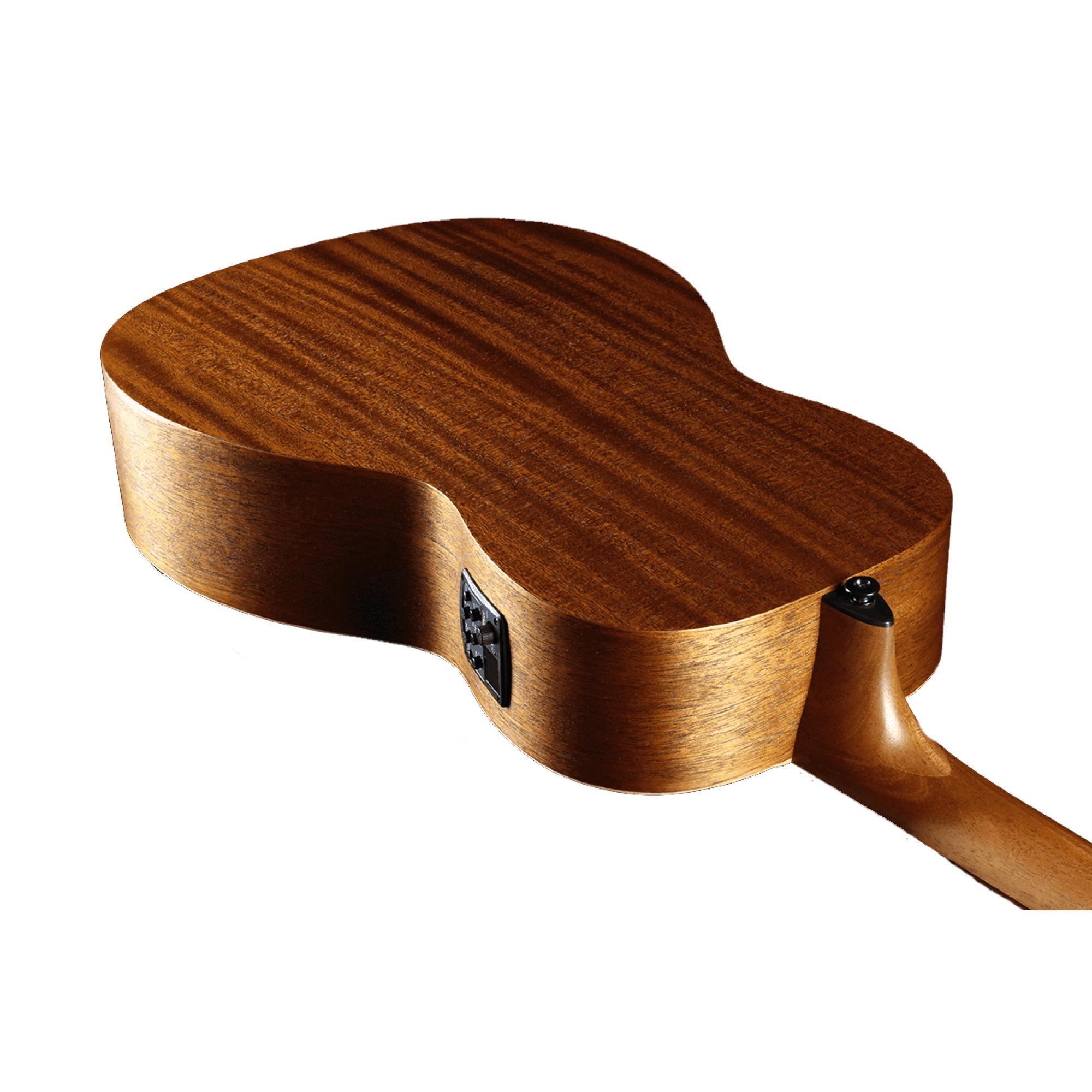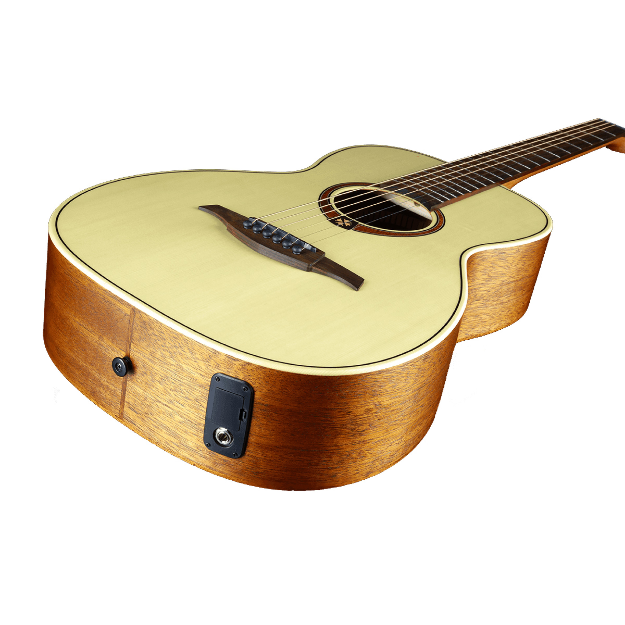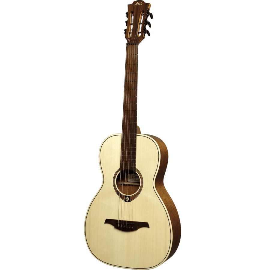 LAG Tramontane T177JCE – это 25,6-дюймовая parlor гитара с цельным топом из энгельманской ели, ламинированной спинкой / грифом из махагони (тропического дерева, принадлежащего к семейству красного дерева, с текстурой, похожей на гондурасское дерево, приглушенными низкими и высокими частотами) и грифом из коричневого BrankoWood. Коричневое дерево – идеальный заменитель палисандра, получаемый из короткоцилиндрической сосны из Новой Зеландии.