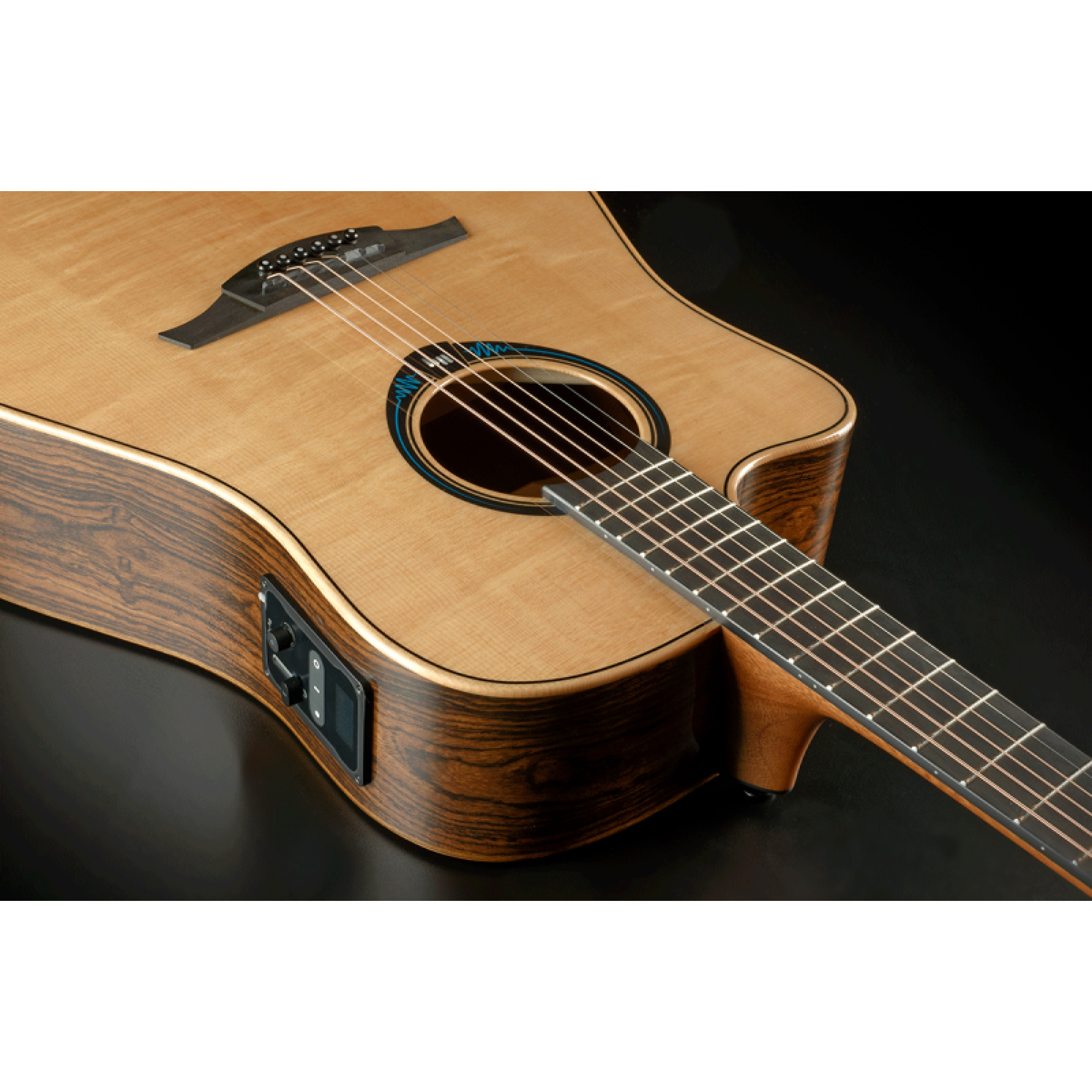 Форма корпуса с левосторонним вырезом создана для обеспечения комфортной игры и легкого доступа к верхним ладам и способствует смелому и сильному звучанию, что делает ее универсальным выбором для исполнения различных музыкальных жанров. Дизайн гитары поддерживает культовую эстетику Lâg: гриф из древесины хайя, графитовые порожки, а также высококачественные литые тюнеры. Сочетание фигурной верхней деки из ели Engelmann Bearclaw Spruce, обечаек и нижней деки из дерева Бокоте и глянцевого покрытия создает визуально потрясающий инструмент, отражающий его премиальное качество.