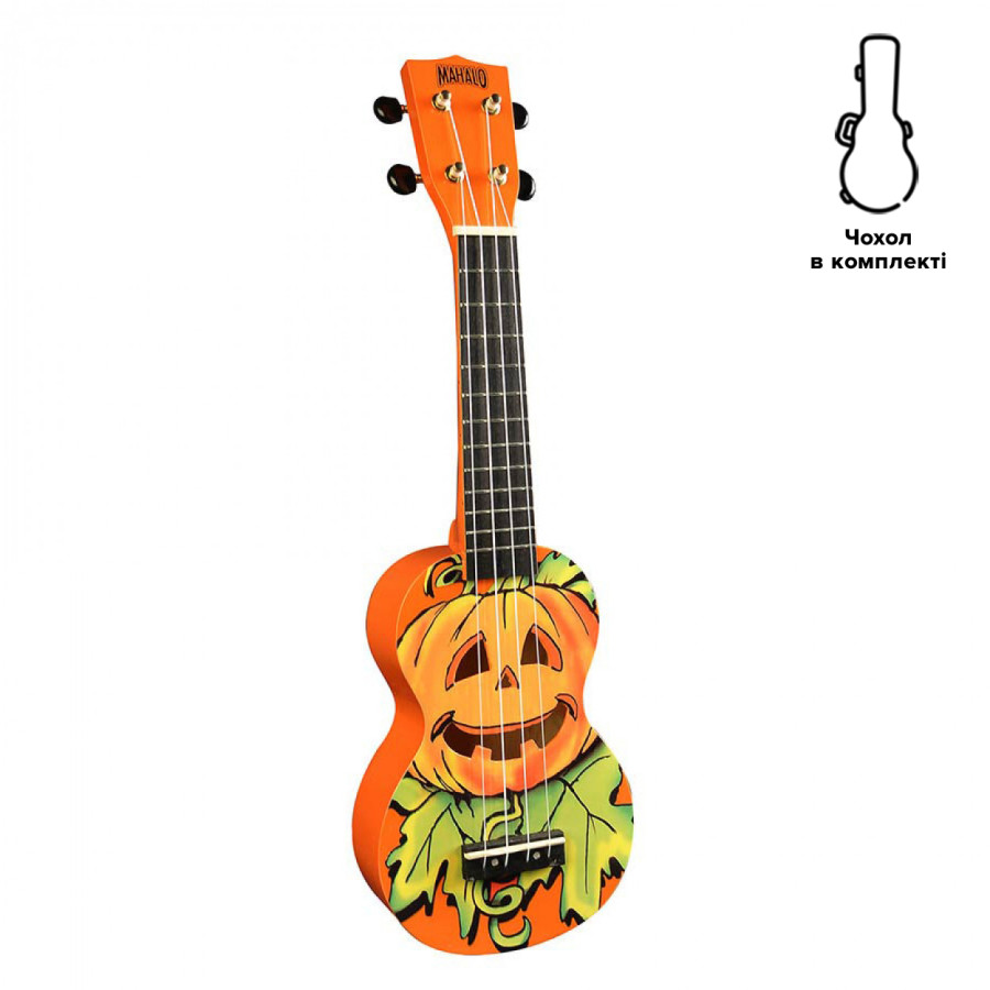Необычная и яркая 4-струнная укулеле типа "Сопрано" от Mahalo. Имеет оранжевый цвет с изображением под названием "Mahaloween". Чехол идет в комплекте с инструментом.