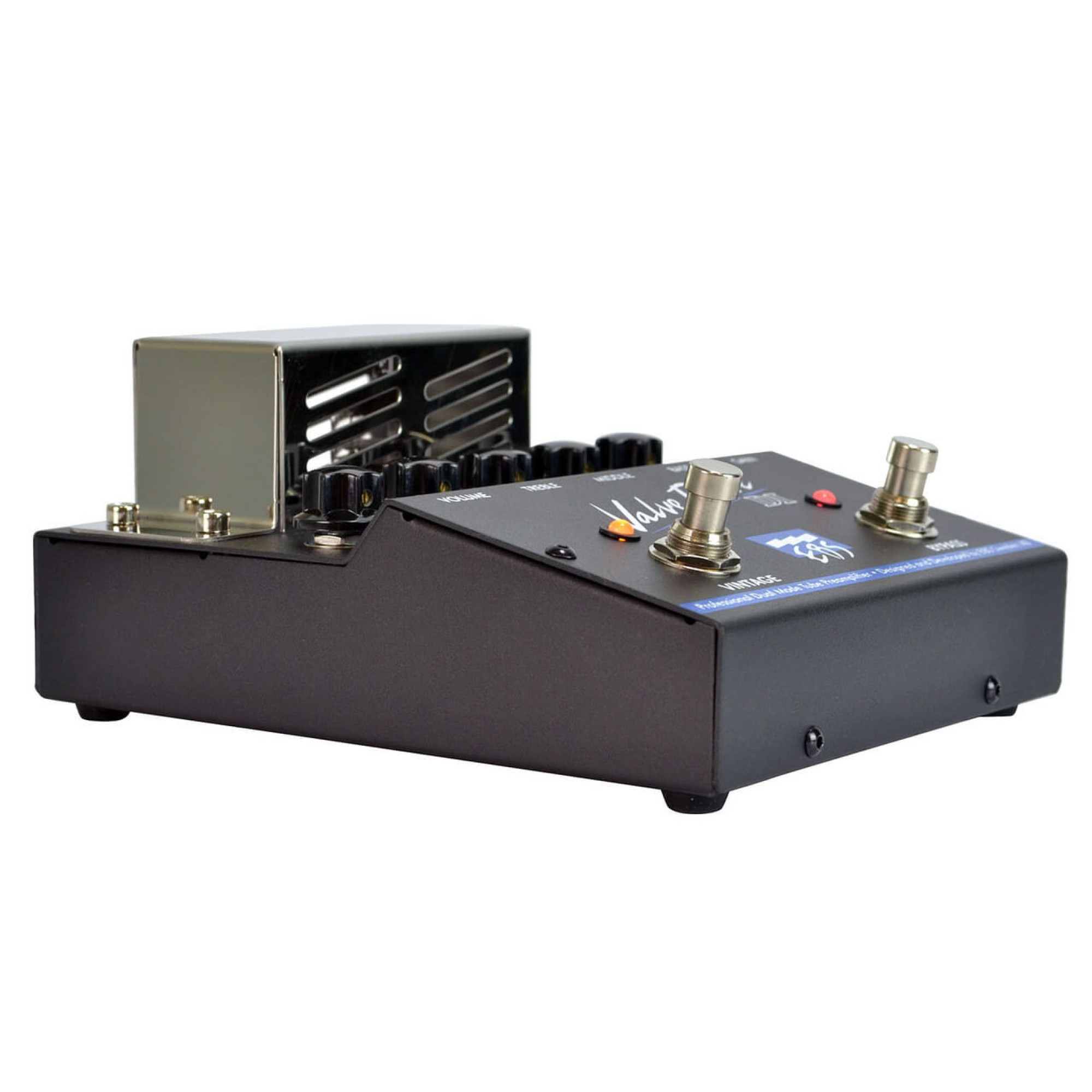 Управление. Педаль имеет регуляторы Volume, Gain, трехполосный эквалайзер (Middle, Treble, Bass), два тумблера, один позволяет перестраивать предусилитель под активный или под пассивный инструмент, другой отвечает за кнопку Active (кнопка будет либо включать true bypass, либо переводить в режим mute) и две кнопки: Vintage (переключение между винтажным ламповым звуком и современным) и Active.