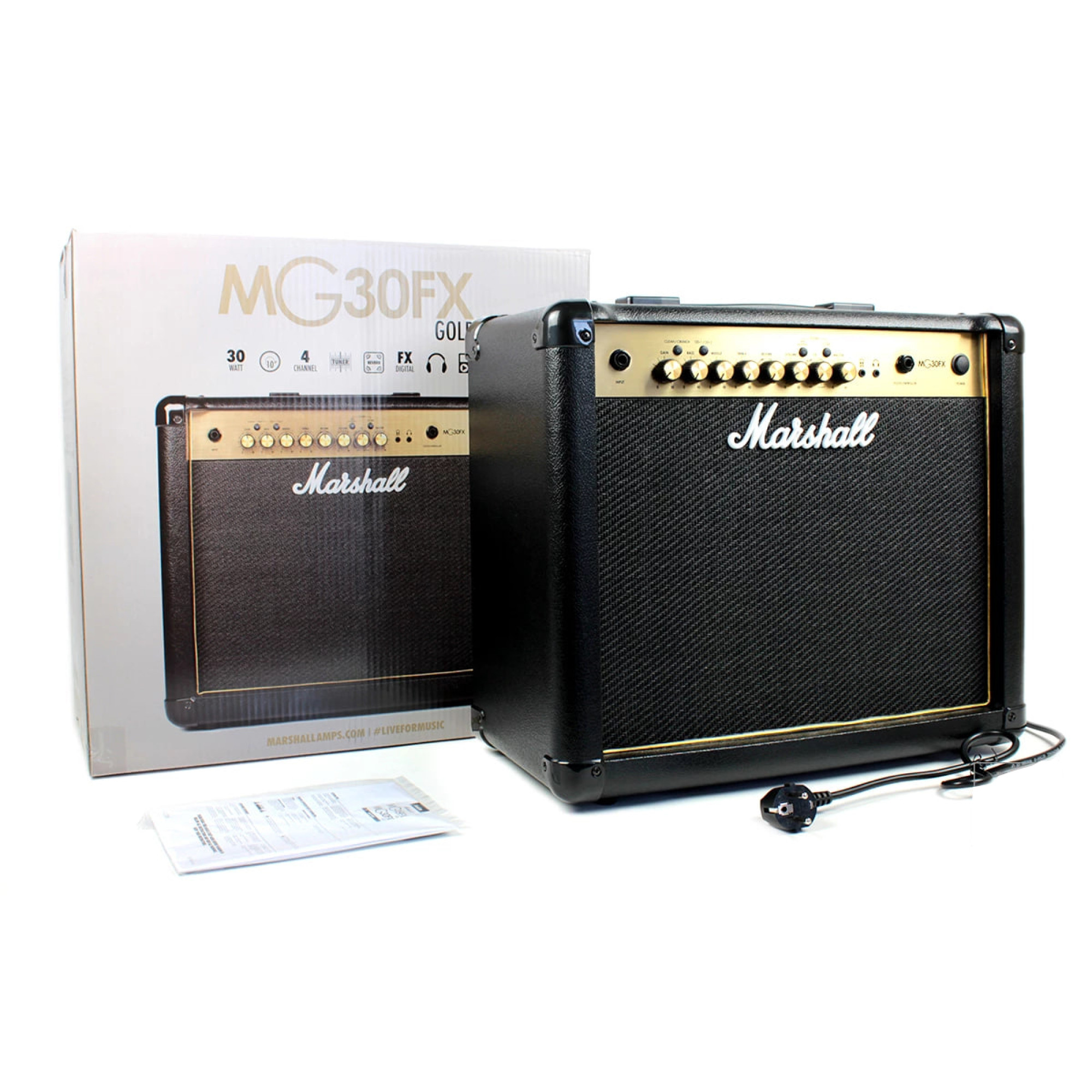 Гитарный комбоусилитель Marshall MG30GFX – это не только знаковый в своем "золотом" дизайне, но и мощный звук, который приятно Вас удивит. Этот портативный усилитель от Marshall предлагает мощность 30 Вт, дополнительные звуковые эффекты и реверберацию – все это в компактных размерах с 10-дюймовым динамиком, что гарантирует удивительную силу звука.