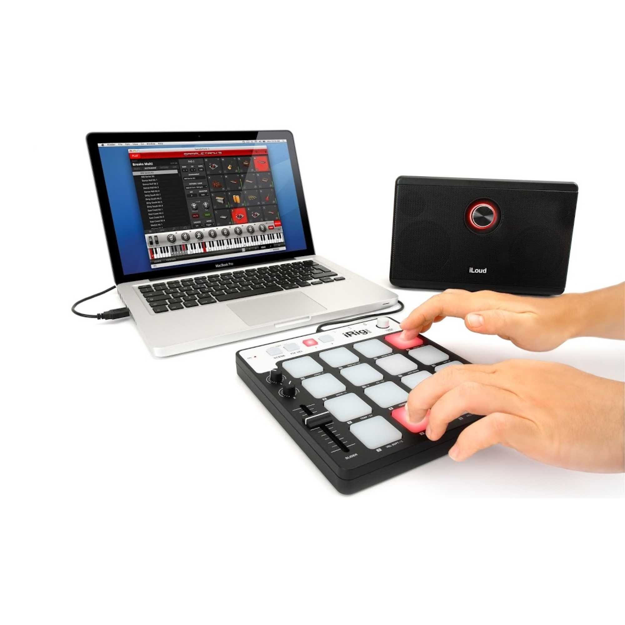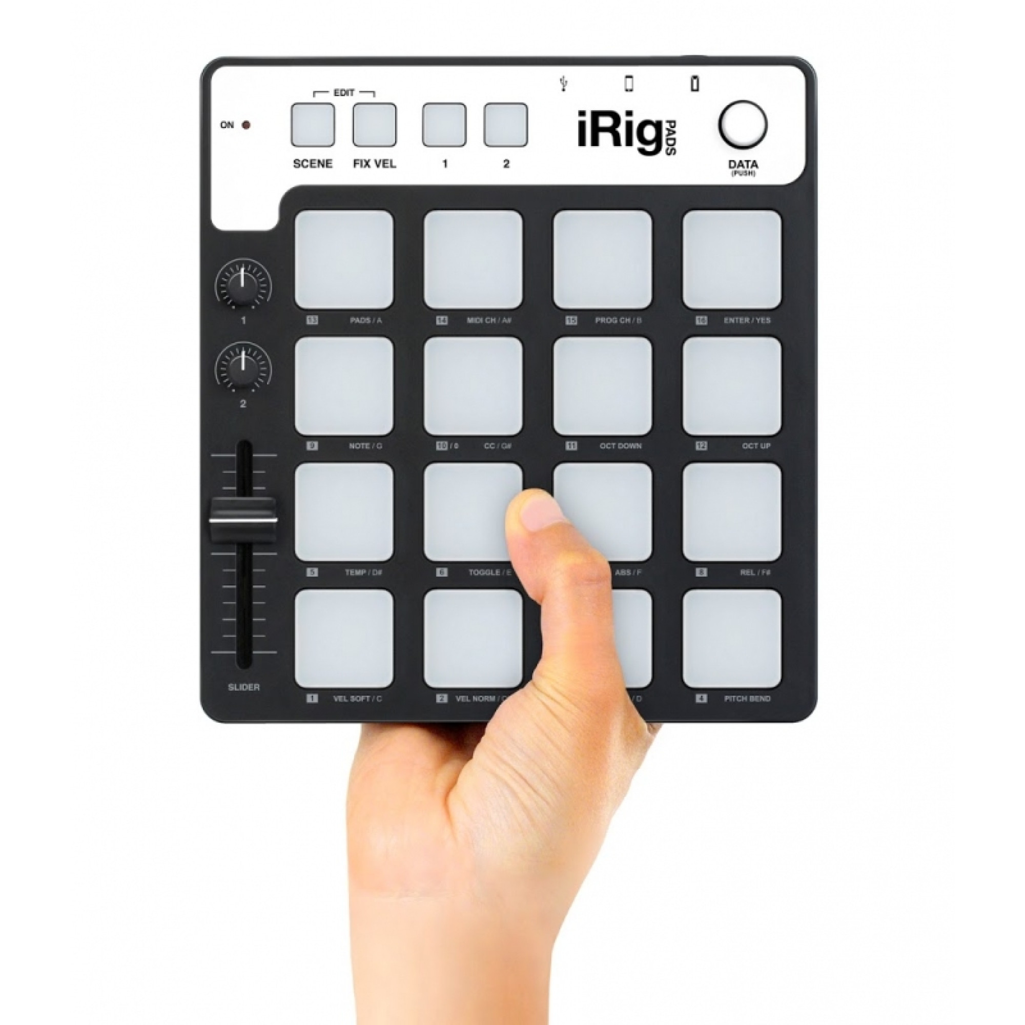 Ультракомпактный грув MIDI контроллер iRig Pads для PC/Mac и устройств Apple. Компания IK Multimedia представляет новинку - ультракомпактный грув MIDI контроллер iRig Pads для PC/Mac и устройств Apple (iPhone, iPad, iPod Touch). Размерами чуть меньше чем iPad и толщиной 23 мм, контроллер легко помещается в сумку или рюкзак и питается от головного устройства, к которому подключается (по USB или Lighting кабелю, поставляются в комплекте).