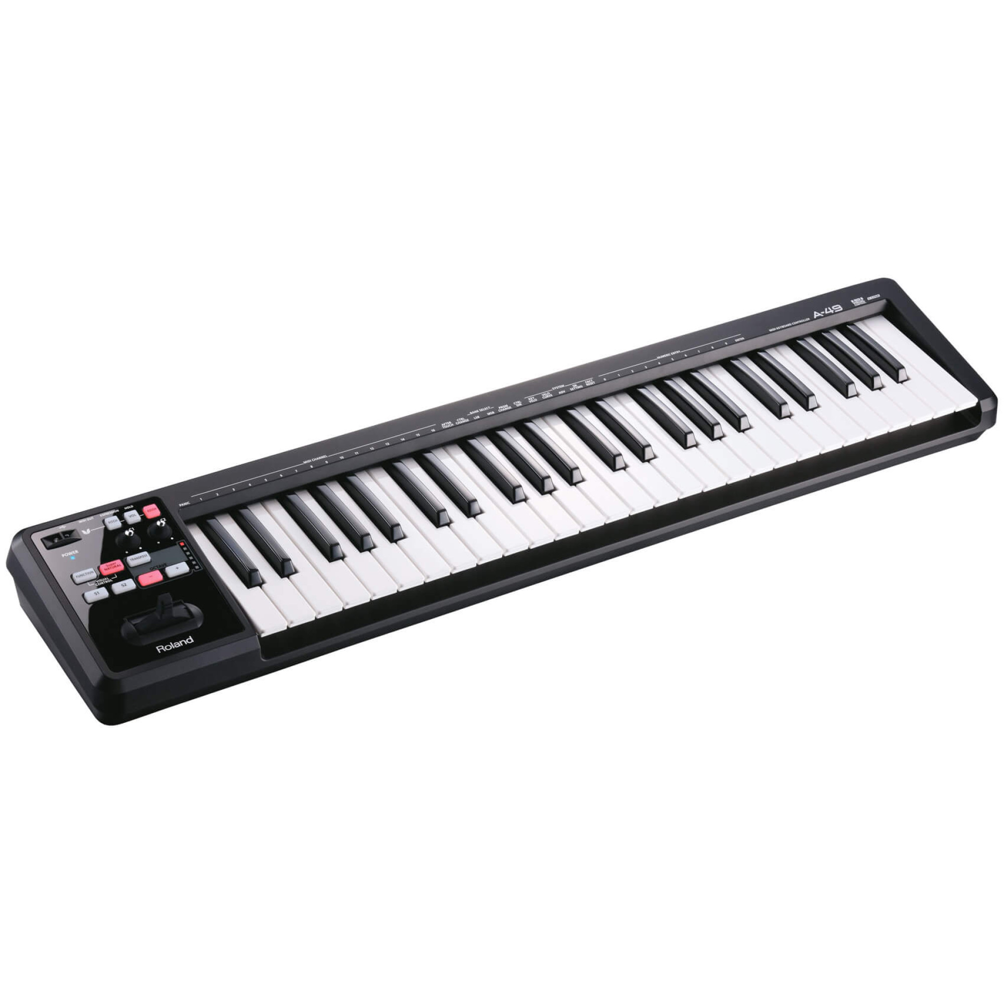 А-49 представляет максимальное удобство при работе с ноутбуками благодаря специальному углублению в задней части. Две кнопки, два регулятора и D-BEAM контроллер - оптимальный набор контроллеров для того чтобы сделать Вашу работу удобной и быстрой. Выделенные кнопки октав позволяют быстрое переключение, а кнопка транспонирования позволяет войти в режим сдвига по полутонам. LED-индикаторы обеспечивают визуальный контроль транспонирования. Все остальные настройки доступны по нажатию кнопки "Function", которая в сочетании с клавишами позволяет выполнять операции указанные над клавишами.