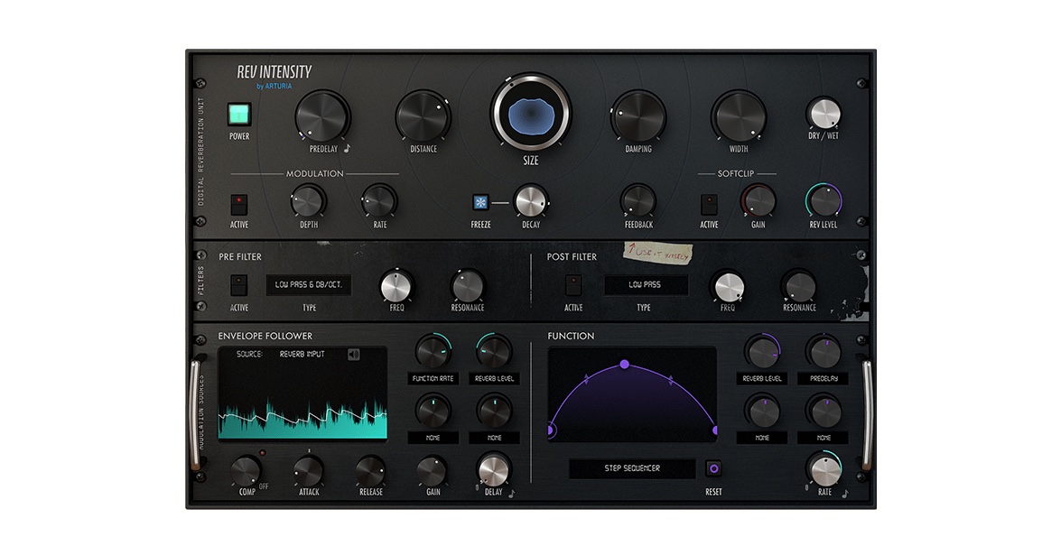 Rev INTENSITY — футуристический цифровой ревербератор, собственная разработка Arturia. Предлагает алгоритмическую реверберацию с огромными возможностями модуляции.