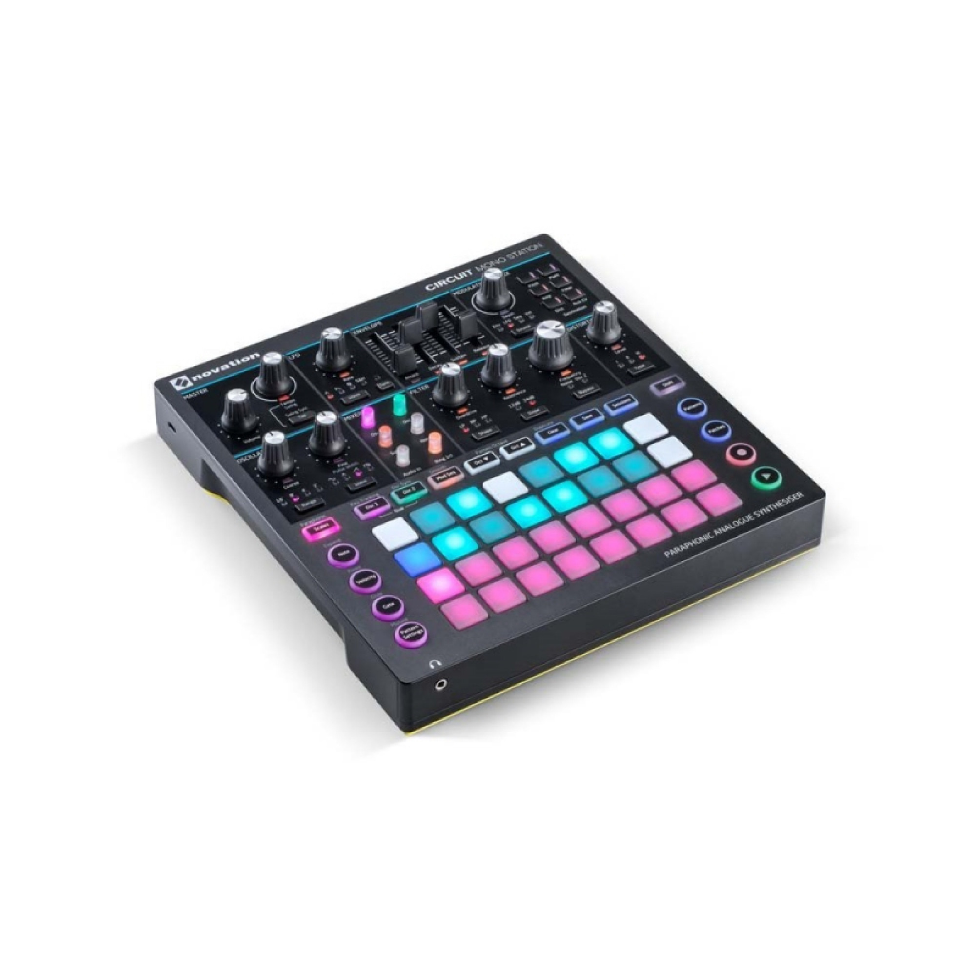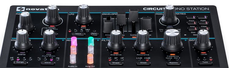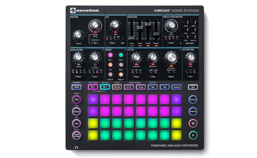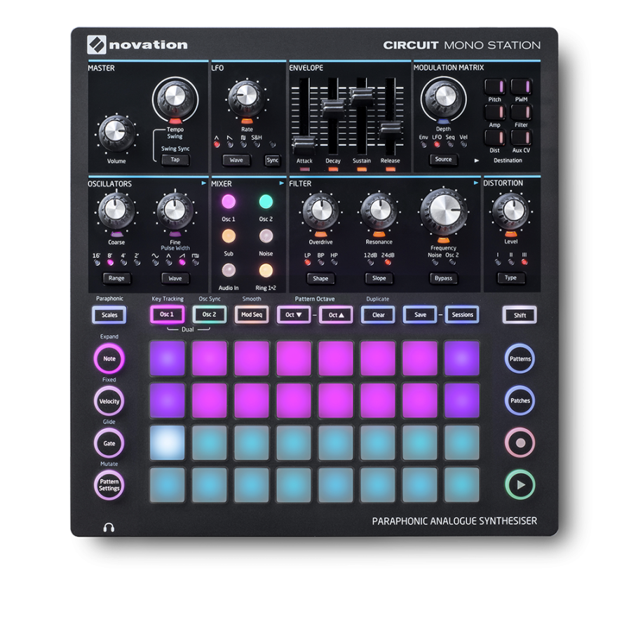Circuit Mono Station представляет собой парафонический аналоговый синтезатор следующего поколения, который берет начало с Bass Station II, с тремя треками секвенсера, которые извлекают пользу из 32 чувствительных к скорости RGB-кнопки, расположенных на Circuit. Синтезатор имеет два генератора, три режима искажения, плюс один многорежимный фильтр, который может быть высокочастотным, низкочастотным или полосовым.