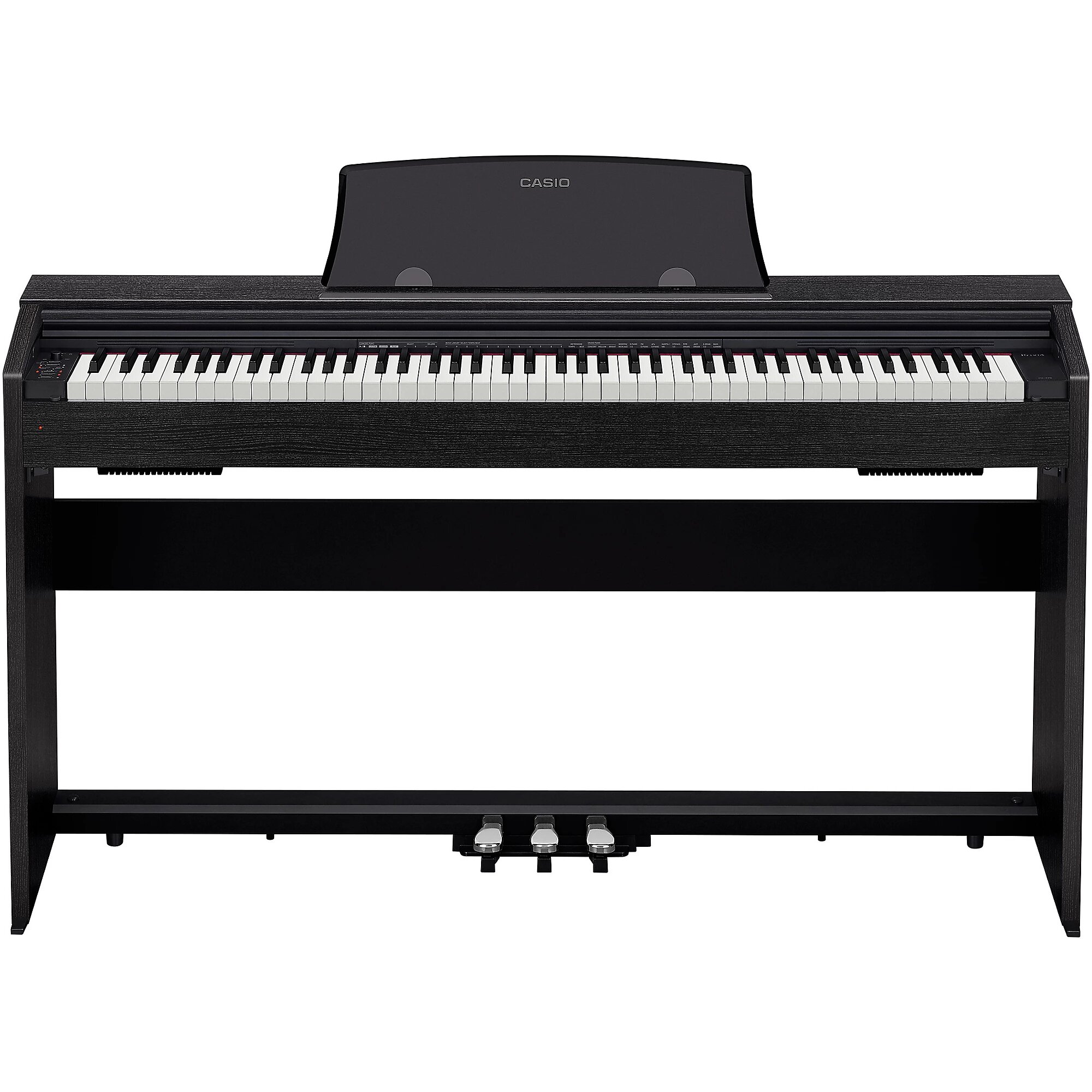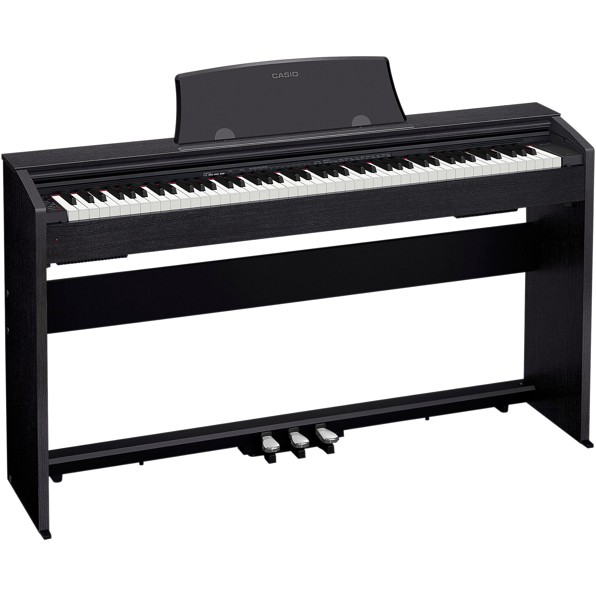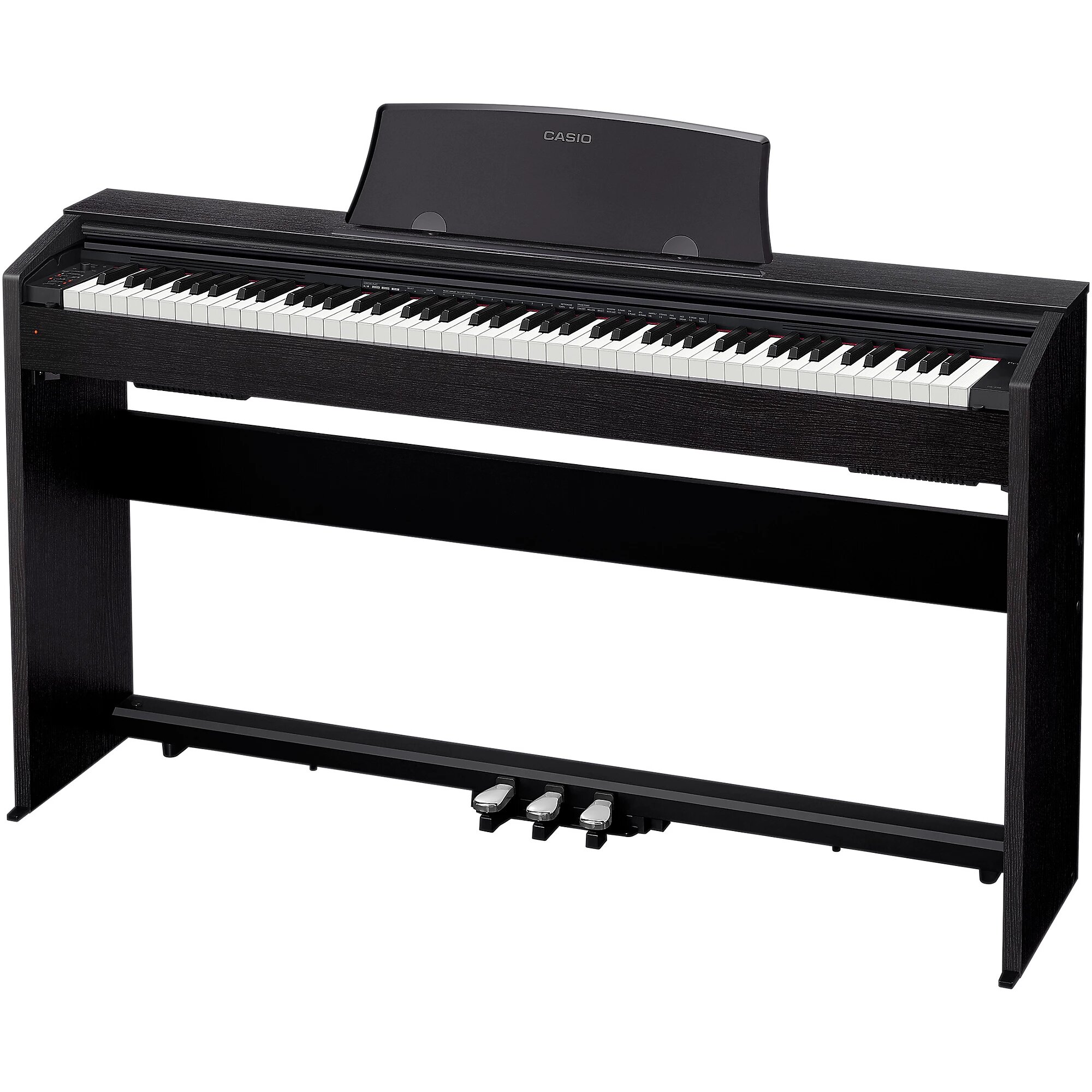 Casio PX 770 обладает клавиатурой нового поколения. 88 взвешенных клавиш покрыты искусственной слоновой костью (белые) и искусственным черным деревом (черные). Помимо того, что такое решение значительно повышает эстетические свойства инструмента, придавая внешнему виду шика и благородства, оно также предотвращает скольжение пальцев исполнителя во время игры. Клавиатура также оснащена точной имитацией молоточковой механики и тремя сенсорами, с помощью которых можно отрегулировать чувствительность клавиш – от низкой до высокой. Это дает возможность пианисту отстроить инструмент под свой уровень мастерства и под свои индивидуальные предпочтения. Возможность регулировки чувствительности клавиатуры также избавляет от сомнений – брать пианино для начинающих с перспективой покупки нового инструмента или, наоборот, взять пианино с более жесткой клавиатурой на вырост. Жесткость клавиатуры будет “расти” вместе с уровнем мастерства!
