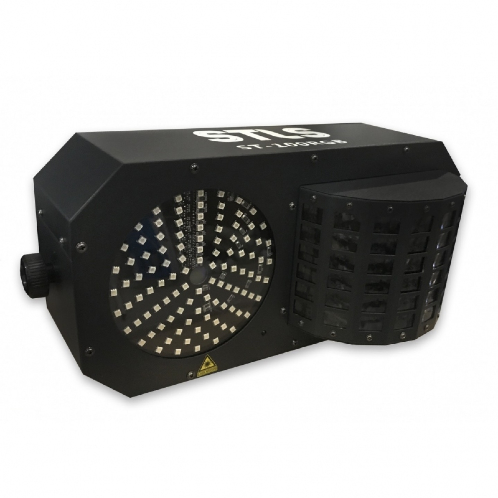 Световой LED прибор STLS ST-100RGB – представляет собой многофункциональное устройство для дискотек. Данная модель включает в себя цветной стробоскоп, трехцветный лазер и эффект derby. Используя такой прибор, Вы значительно экономите место, так как вместо трех разных устройств, получаете одно.