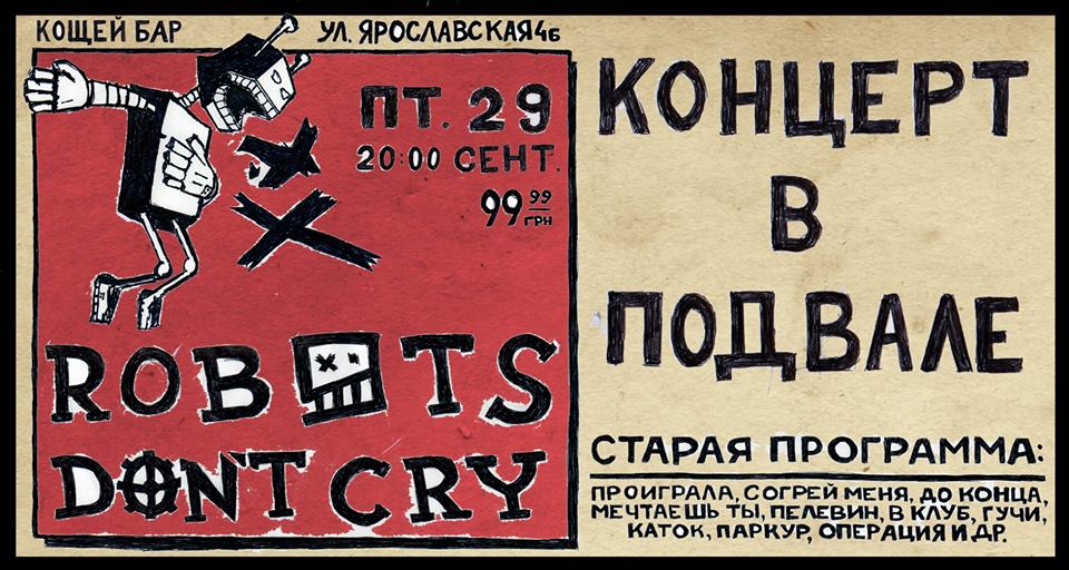 Да, именно в подвале. Но для панк-группы – это именно то место, которое нужно. Если хотите релакснуть в баре под интересную музыку в конце рабочей недели – тогда Вам на неформальный концерт Robots Don’t Cry.