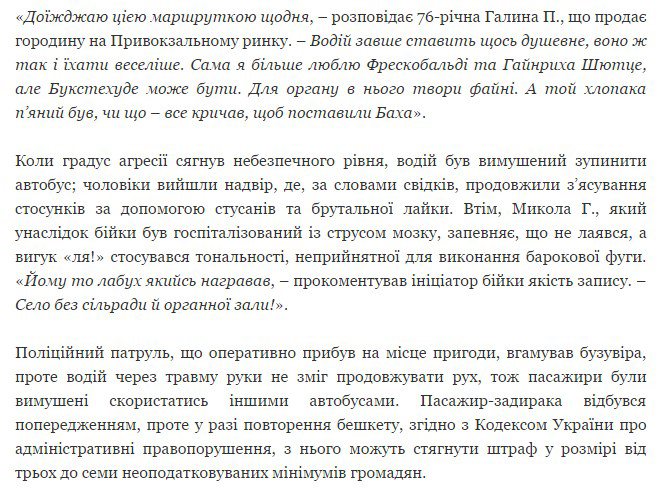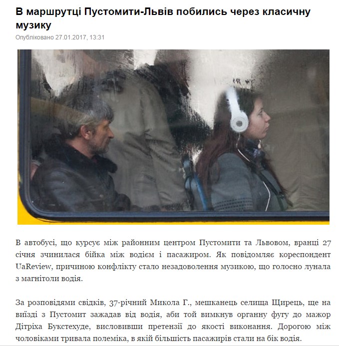 Так, отмечалось, что утром 27 января в рейсовом автобусе сообщением «Пустомыты – Львов» произошла драка между водителем и пассажиром. По данным корреспондента UaReview, конфликт вызвала музыка, которая звучала громко с магнитолы водителя и не удовлетворяла потребностей невольных слушателей.