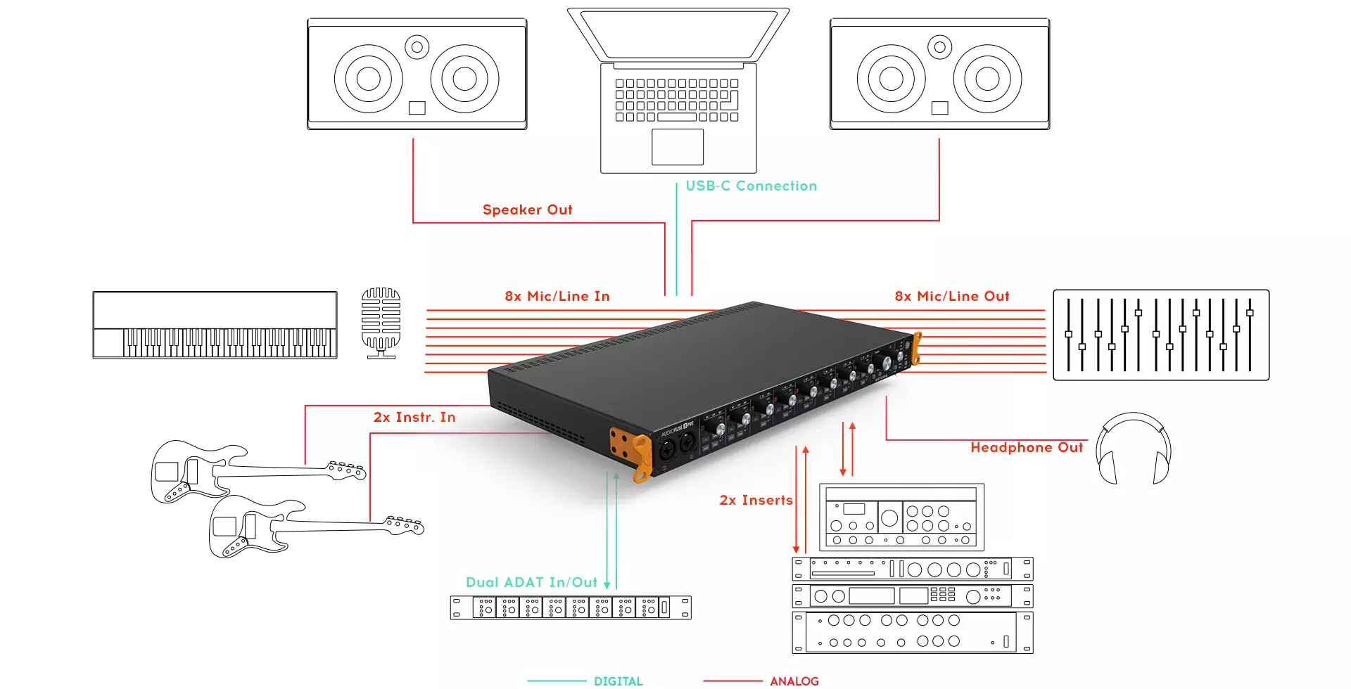 Когда Вы вкладываете свое сердце и душу в музыку и произведения, Вы должны знать, что ваш звук в надежных руках. AudioFuse 8Pre предлагает небывалое для своей цены качество. В линейке AudioFuse используются лучшие преобразователи из серии AKM — они проводят сигнал практически нетронутым. 8 предусилителей Discrete Pro и тракт аналогового сигнала позволят Вам действительно «услышать» Ваш звук в первый раз. Сверхнизкий эквивалентный входной шум позволяет улавливать каждую деталь, в то время как входное усиление в 72 дБ откроет доступ к записи даже самыми требовательными микрофонами с низким уровнем выходного сигнала. Все это хорошо сочетается с практически плоской частотной характеристикой интерфейса для достижения полной прозрачности.