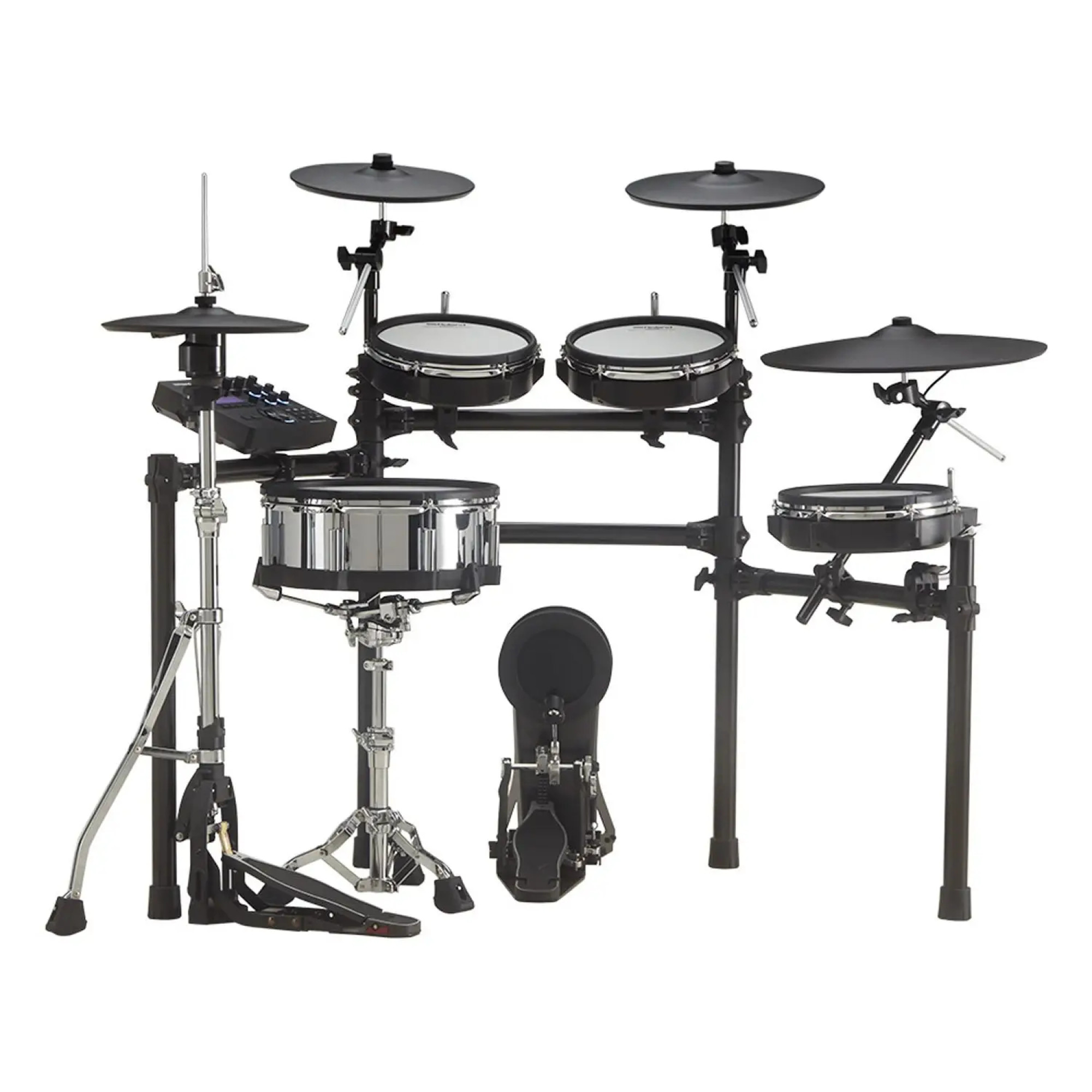 Многие электронные ударные установки сильно отличаются от акустических, в основном из-за маленьких пэдов и меньшей высоты. TD-27KV развеивает эту условность благодаря пэдам и тарелкам большого диаметра, представляя собой просторную компоновку, благодаря которой каждый барабанщик чувствует себя как дома. 14-дюймовый малый барабан из нержавеющей стали и 10-дюймовые томы оснащены легендарными многослойными сетчатыми пластиками Roland, обеспечивающими непревзойденный отклик и регулируемое натяжение для естественного отскока. 12-дюймовые тарелки хай-хэт устанавливаются на стандартную акустическую стойку в то время как 18-дюймовая тарелка райд и 12-дюймовая и 13-дюймовая тарелки крэш установлены на прочных штангах для отличного ощущения и аутентичного движения. Передовая технология цифровых пэдов Roland делает звучание V-Drums еще более реалистичным. Цифровые пэды малого барабана и райда подключаются к модулю TD-27 через USB-кабели, работая вместе со звуковым модулем для обеспечения наиболее естественной экспрессии, позволяя услышать Ваши навыки игры на барабанах в невероятных деталях. Многочисленные датчики и молниеносная обработка обеспечивают удивительный отклик, позволяющий воспроизводить подлинные приемы самым естественным образом.