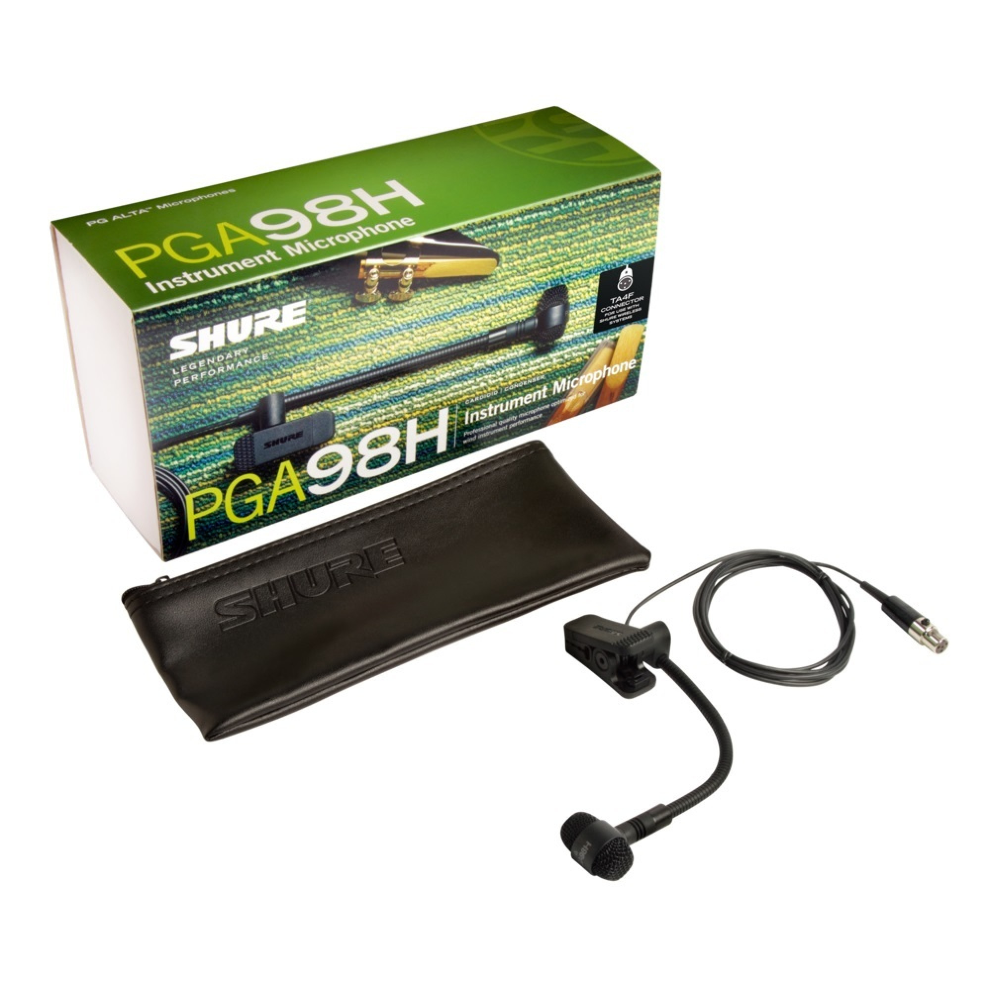 Shure PGA98H – кардиоидный конденсаторный инструментальный микрофон профессионального качества для духовых инструментов с обновленным дизайном, черной металлической отделкой и решеткой, обеспечивающей ненавязчивое визуальное присутствие. Обладая гибкой дискретной конструкцией «гусиная шея», рупорным зажимом и разъемом TA4F для использования с беспроводными системами, PGA98H идеально подходит как для живых выступлений, так и для записи.
