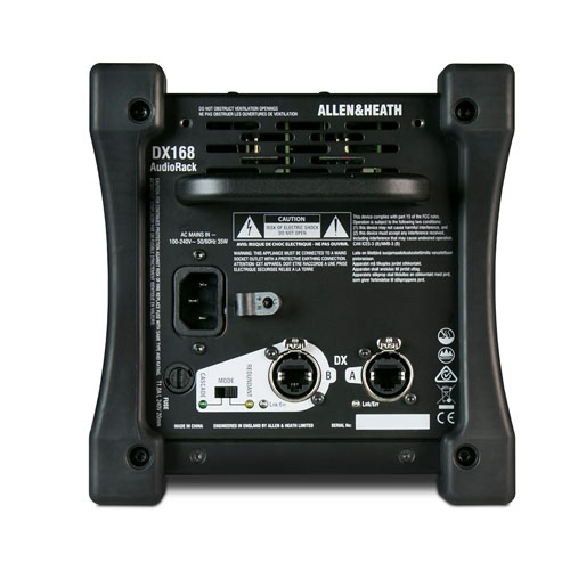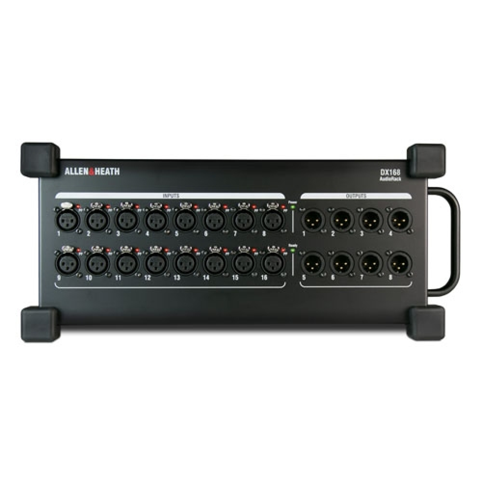 DX168 изготовлен в достаточно компактном, но прочном корпусе и обладает удобной ручкой специально для транспортирования. Съёмные резиновые бамперы обеспечивают дополнительную защиту блока, что предоставляет возможность для размещения его прямо на полу сцены. Впрочем, установить новый Allen&Heath DX168 также возможно, и в стандартный 19-дюймовый рэк при помощи опционального комплекта креплений.