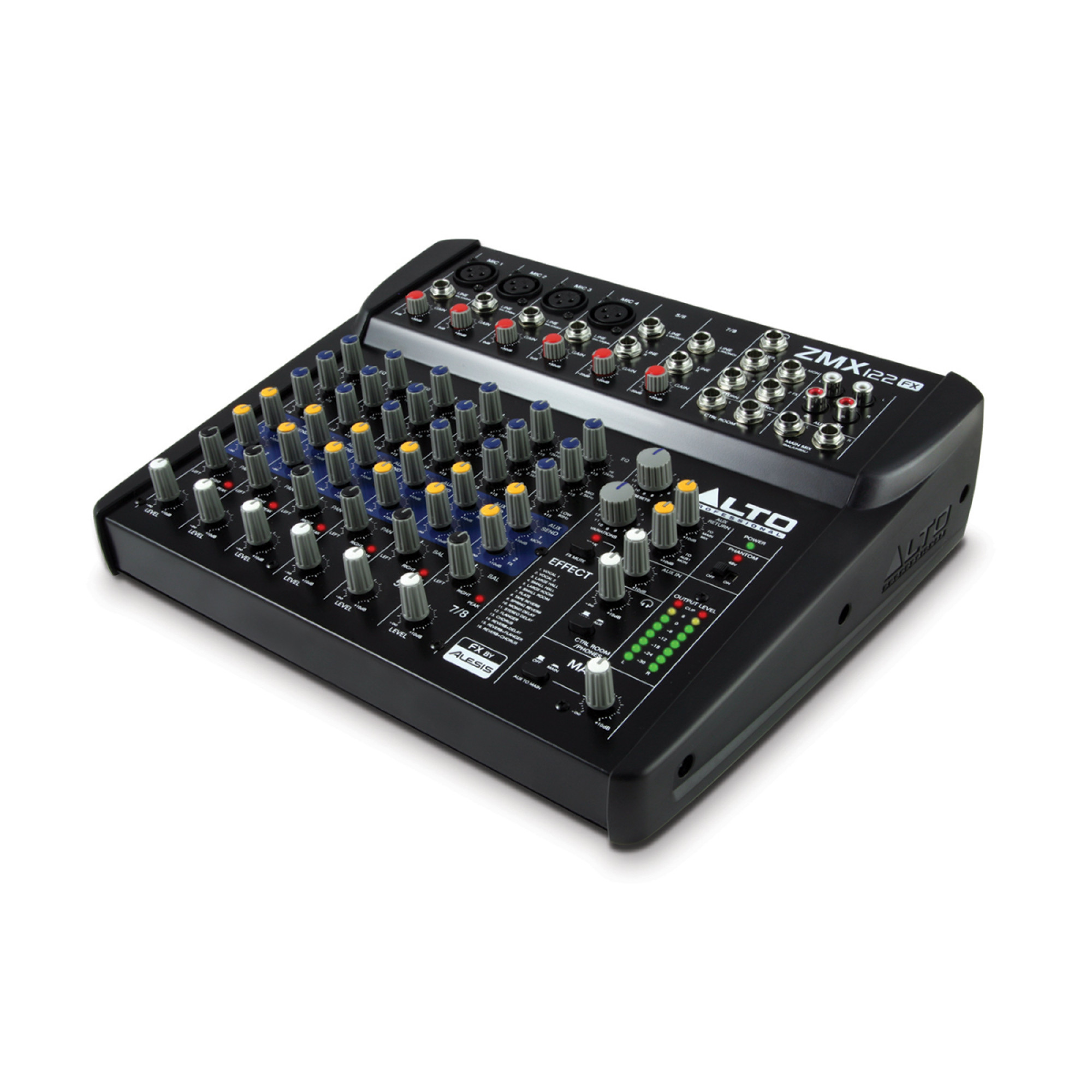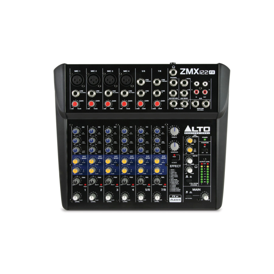 Профессиональные функции в переносном устройстве. Alto Professional ZMX122FX – это 8 канальный микшер со всеми входами, выходами, маршрутизацией, эквалайзером и эффект процессором, необходимыми для небольших живых выступов. Он имеет четыре микрофонных/линейных входа, две стереопары, 3 полосный эквалайзер и две внешние ссылки на каждом из каналов, а также отдельный стереовход для подключения дополнительных аудио устройств.