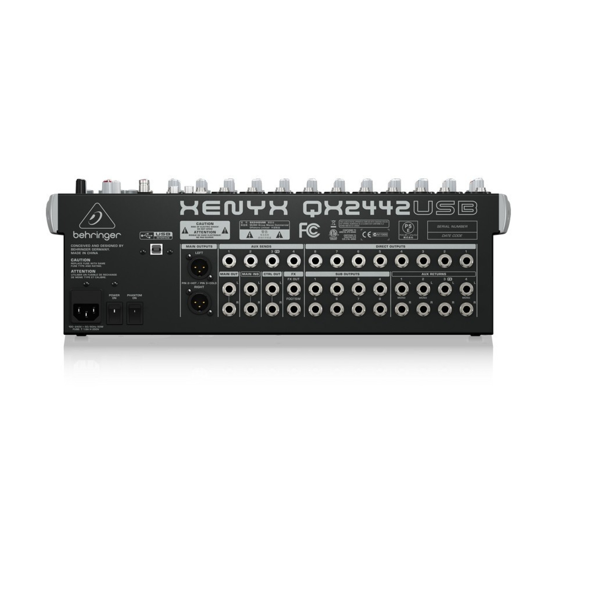 QX2442USB имеет 10 микрофонных входа, 4 стерео канала, 4 Aux посыла, 4 стерео Aux возврата плюс легкие в использовании компрессоры на все моно каналы. Другими важными характеристиками являются четыре подгруппы для гибкости микширования, L/R Main Inserts (идеальный путь подключения графических эквалайзеров или компрессоров) и 8 Direct Outs и Sub Outs для аналоговой записи. Благодаря встроенному приемнику ULM можно наслаждаться беспроводной микрофонной функциональностью.