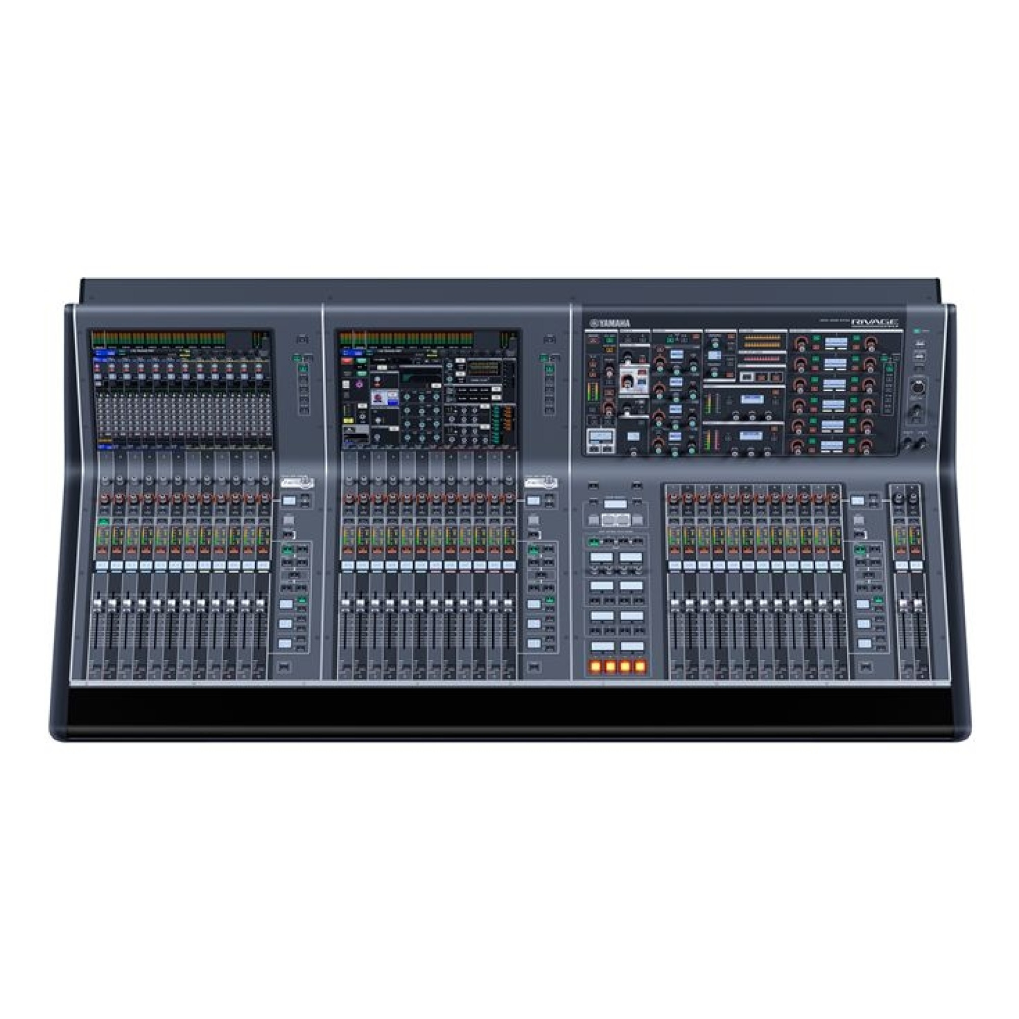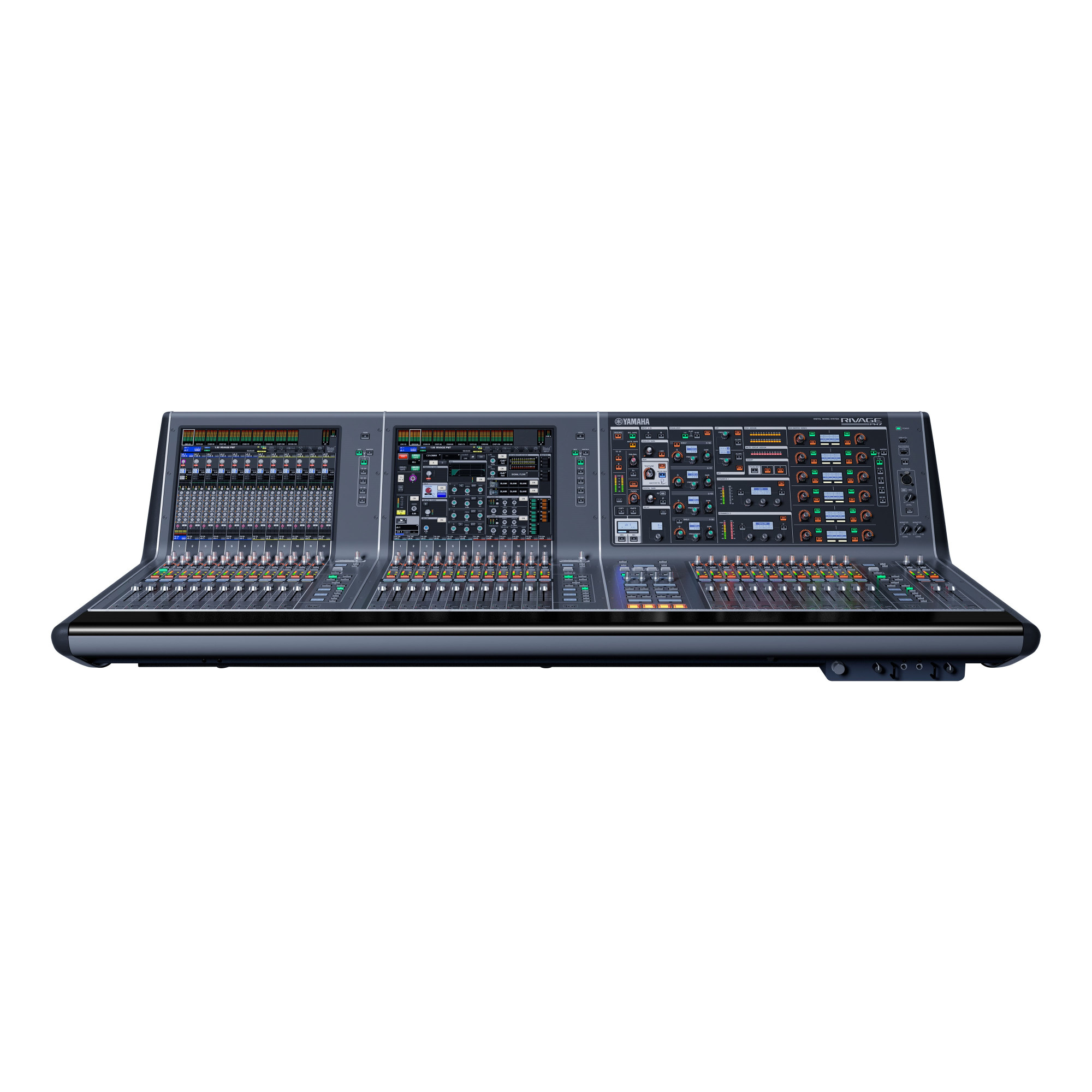 Панель управления RIVAGE PM7 имеет три группы по 12 фейдеров, на которые можно назначать каналы при необходимости. Две группы фейдеров с левой стороны работают совместно с большими сенсорными дисплеями на верхней панели, обеспечивая расширенную версию рабочей среды Centralogic. Канальные линейки переходят непосредственно в сенсорный дисплей, образуя цельную и логичную схему управления. Возможность управления группами, каждая из которых включает по 12 каналов, обеспечивает универсальный контроль практически для любого рабочего процесса.