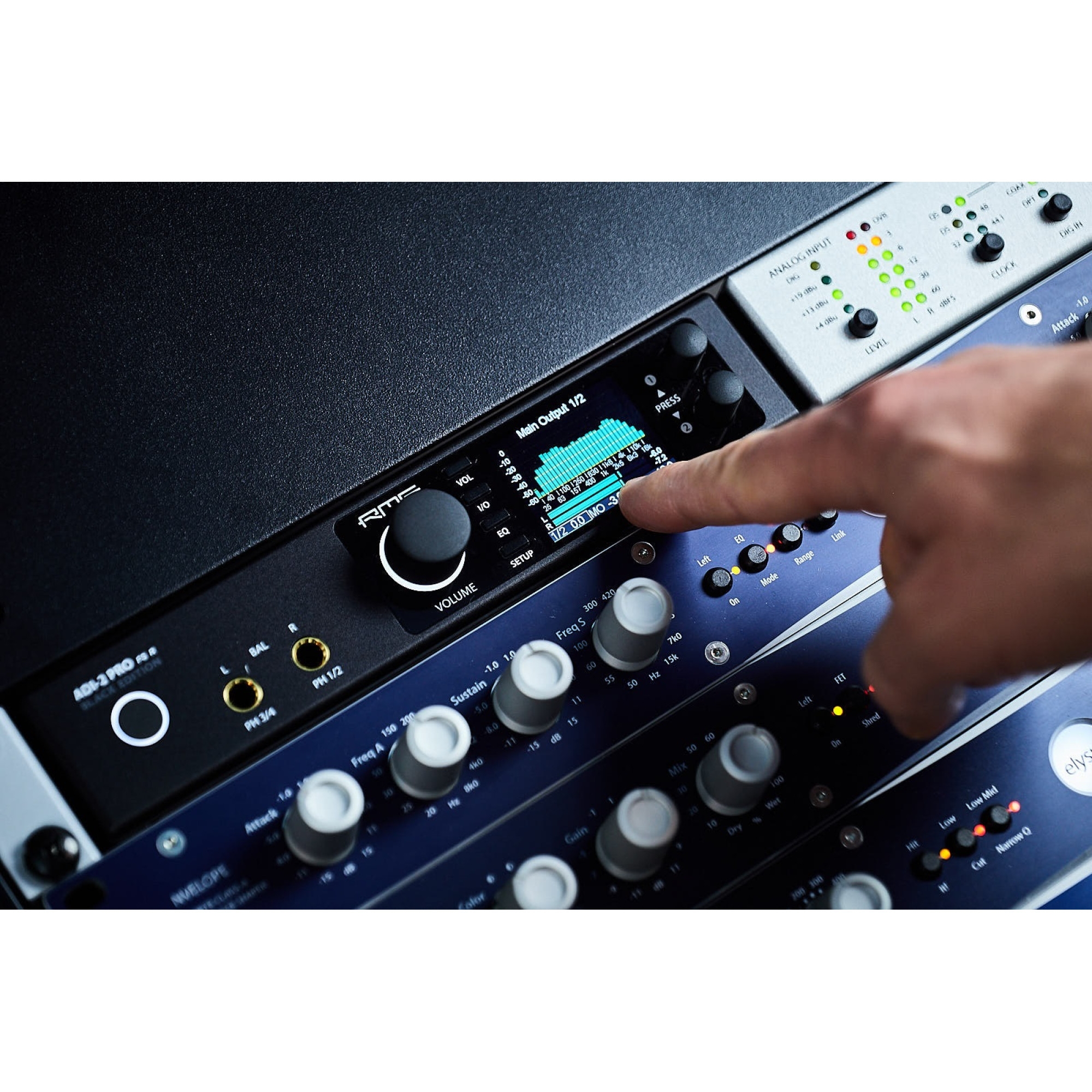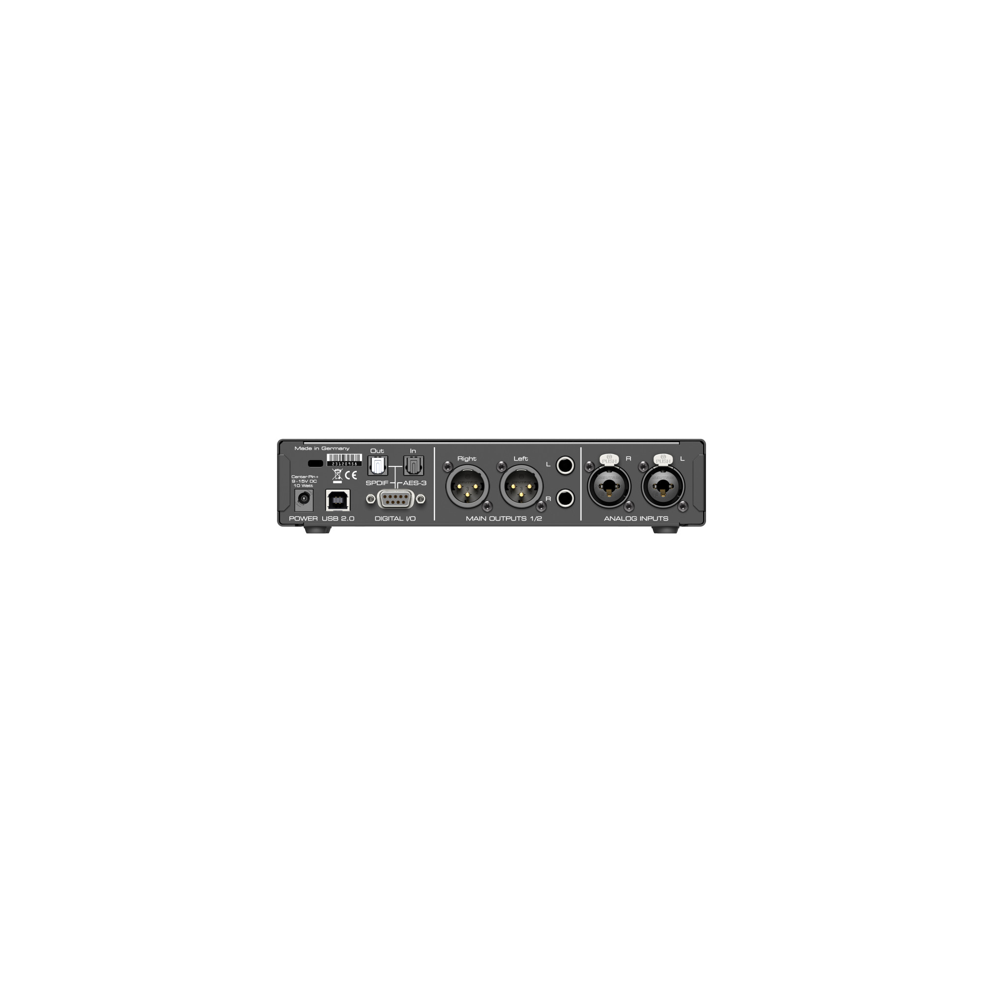 На задней панели устройства имеются два аналоговых входа на комбинированных разъемах XLR - TRS 1/4”, которые обеспечивают балансированное соединение. Эти входы имеют переключение чувствительности, что позволяет настраивать оптимальный уровень сигнала и обеспечивают высокое качество звука с минимальными искажениями и высоким соотношением сигнал/шум. Выходы XLR поддерживают уровни сигнала до +24 дБу, а TRS – до +19 дБу, что позволяет обеспечивать чистый и мощный звук.