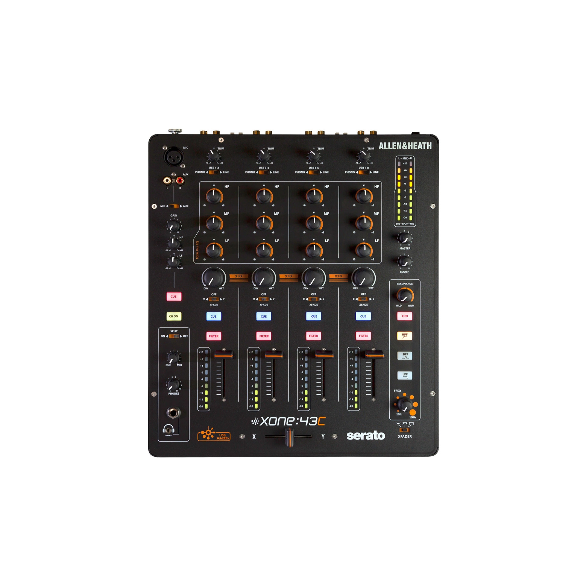 XONE:43C также имеет в своем арсенале высококачественную внутреннюю 16-канальную звуковую карту USB для интеграции в цифровые рабочие процессы ди-джеев, а также подключение plug-n-play через X: LINK к контроллерам серии XONE: K для расширенного управления MIDI.