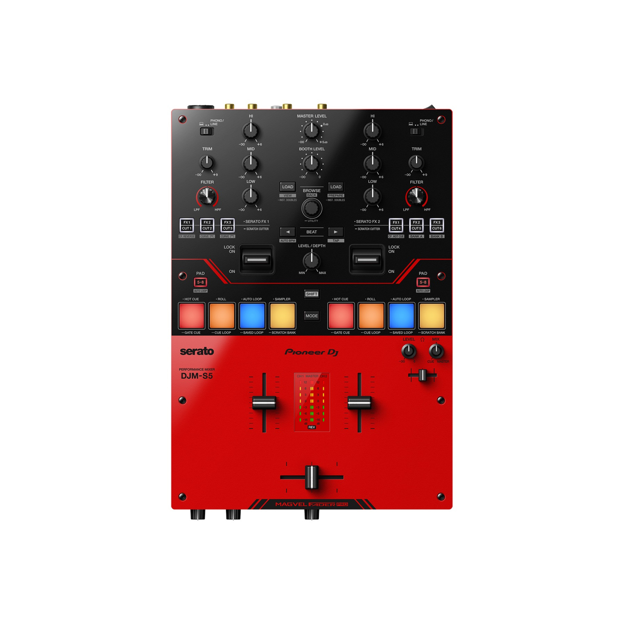 Микшерный пульт для DJ Pioneer DJM-S5 – это идеальный инструмент для тех, кто интересуется батл-миксингом и скретчем, или для начинающих, которые хотят погрузиться в мир диджеинга. Он оснащен передовым кроссфейдером MAGVEL FADER PRO, который можно настроить и получить оптимальный уровень сопротивления для скретча. Также есть возможность управлять до 57 эффектами в Serato DJ Pro с помощью 2 больших ручек эффектов, напоминающих используемые на флагманском DJM-S11.