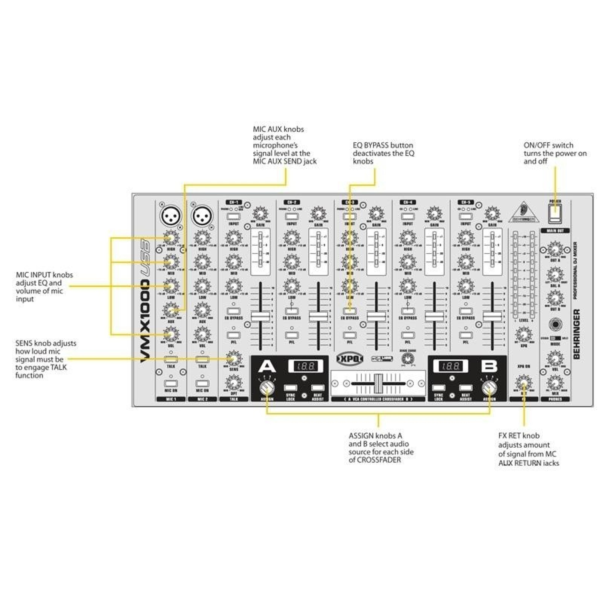 Микшеры VMX1000USB, VMX300USB и VMX200USB содержат XPQ стерео эффект окружения, 3-полосный эквалайзер, регулятор Gain и прецизионные измерители уровней на каждом канале. Кроме того, в VMX1000USB на каждом стереоканале предусмотрен выключатель эквалайзера и выход на сабвуфер. Есть также функция мониторинга с регулятором баланса PLF/main баланс и опция split (разделение), а также функция talkover с отдельным управлением уровней глубины и чувствительности. Модель VMX1000USB имеет упрощенный принцип управления и имеет 2-полосный эквалайзер и измеритель уровня для главного выхода MAIN.