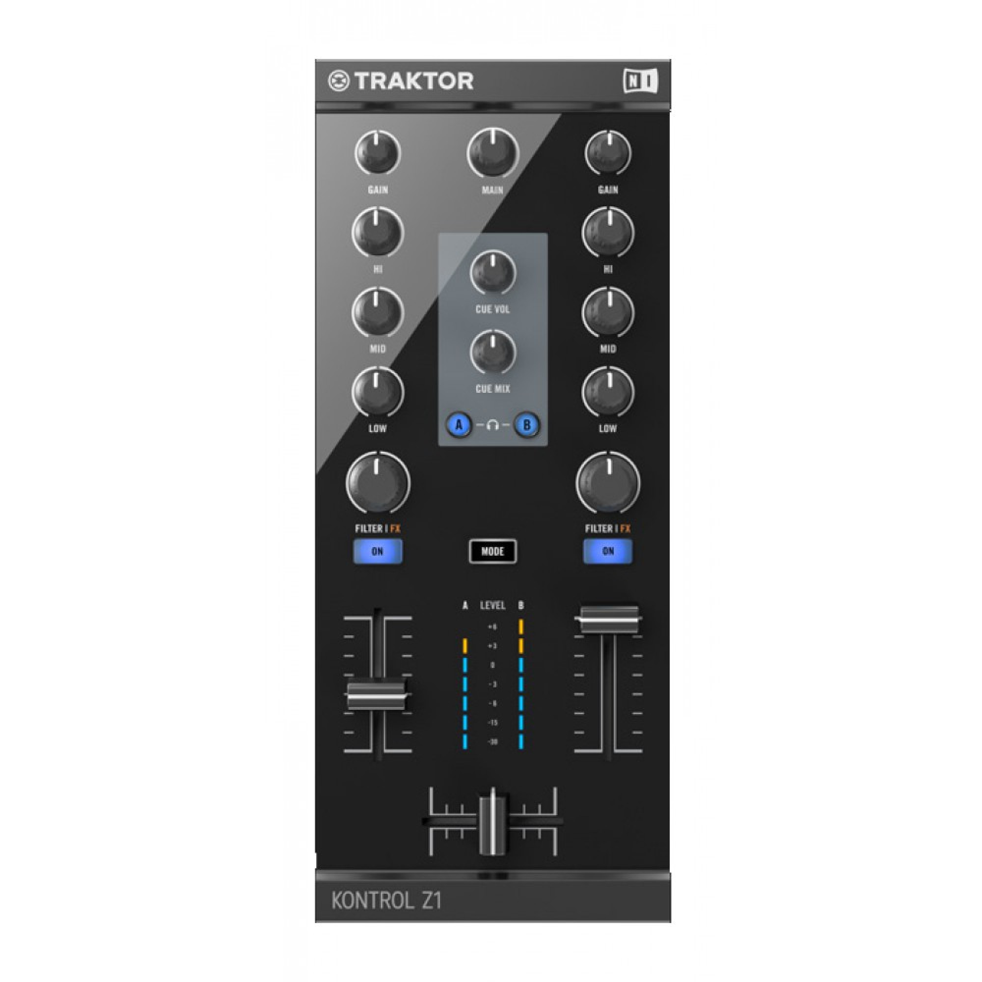 Благодаря 3-полосному эквалайзеру, специальным контролям усиления и фильтр ручкам для каждого из двух каналов, верхняя часть TRAKTOR KONTROL Z1 обеспечит вас полным тактильным контролем над вашими сетами. При использовании Traktor DJ нажатие и удерживание кнопки Mode самостоятельно переключает деки между фильтром (кнопка становится синей) и FX-управлением (кнопка становится оранжевой). При использовании TRAKTOR PRO 2, кнопка Mode осуществляет переключение между фильтрами низкого и высокого резонанса.