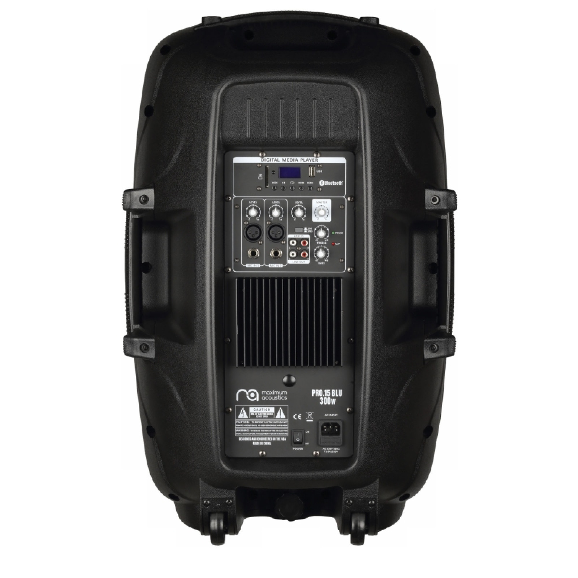Акустическая система оборудована усилителем АВ-класса. Динамик: 15" объемом 1,8 л с катушкой 3". Титановый ВЧ-компрессионный драйвер - 44 мм. В комплект входит пульт дистанционного управления! Pro.15 BLU дает возможность одновременного подключения двух микрофонов. На задней панели расположены два микрофонных XLR-входа и два линейных входа на 1/4" jack с независимым контролем уровня сигнала для каждого, RCA-входы и выходы из регуляторов уровня сигнала и регулятор громкости MP3-плеера. Акустическая система оборудована двухполосным эквалайзером и общим регулятором громкости (Master), у которого расположены также светодиодные индикаторы CLIP и POWER. Корпус из ABS-пластика делает Pro.15 BLU прочной и долговечной в условиях интенсивного использования. По бокам и сверху корпуса размещены удобные ручки для переноски, а снизу акустическая система имеет колёсики которые облегчают ее транспортировку. Эта акустическая система отличается высоким качеством звучания и универсальностью. Идеально подойдет для использования на вечеринках, свадьбах и любых мероприятиях, проходящих в помещениях площадью до 100 кв.м.