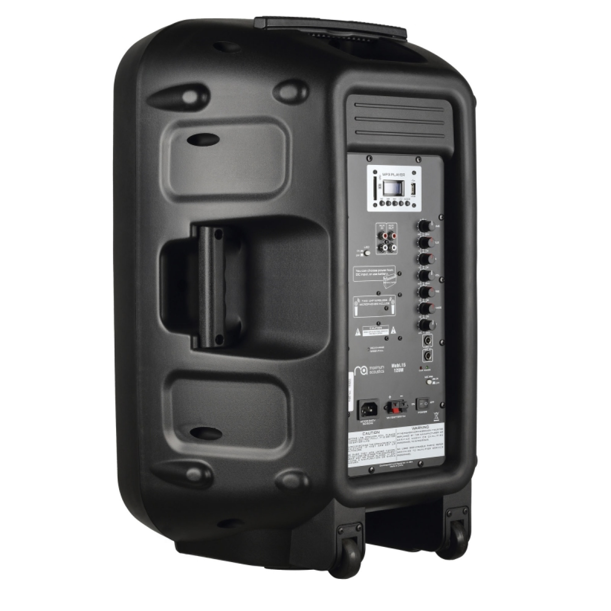 Maximum Acoustics Mobi.15 - 2-полосная портативная, активная акустическая система. Имеет на борту встроенный MP3-плеер, который воспроизводит аудио с SD-карт, а также может взаимодействовать с другими устройствами благодаря USB порту и Bluetooth, светодиодную подсветку и дистанционное управление.
